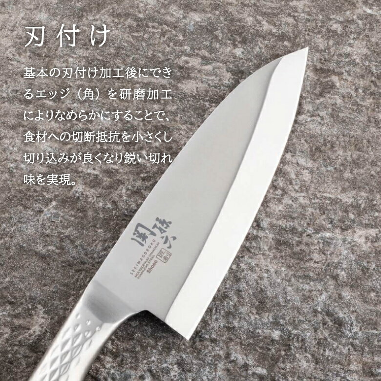 【商品情報】清潔に扱えて爽快な鋭い切れ味。継ぎ目のないオールステンレス製のシリーズ。グリップ感の高い流線型のハンドルデザインを採用。●柄(ハンドル)衛生的なオールステンレスハンドル。刃体からハンドルまで一体構造のため洗いやすく、熱湯消毒・食器洗浄機や食器乾燥器にも使用できます。指かがりが良く、グリップ感の高い流線型のハンドルデザインで操作性にも優れています。●刃体高硬度のステンレス鋼を使用することで切れ味の持続性を高めました。●刃付け基本の刃付け加工後にできるエッジ(角)を研磨加工によりなめらかにすることで、食材への切断抵抗を小さくし切り込みが良くなり鋭い切れ味を実現。【サイズ】●約54×280×21mm【刃渡り】●約150mm【重量】●約230g【材質】●刃体:モリブデンバナジウムステンレス刃物鋼●柄:18-8ステンレススチール【生産国】●日本【備考】●食洗機OK【その他】なし関連商品貝印 関孫六 銀寿ステンレス和包丁000AK5062 左用出刃包丁 J...貝印 関孫六 銀寿ステンレス和包丁000AK5068 刺身包丁 JAN...\LDK掲載/ 貝印 関孫六 ペティナイフ 120mm 木蓮 000A...4,540円4,150円5,500円包丁 家庭用 日本製 国産 使いやすい 関孫六 貝印 AB5166 匠...こども包丁 キッズナイフ 包丁 家庭用 日本製 国産 使いやすい 関孫...貝印 関孫六 000AK1102 金寿ST 出刃包丁 165mm JA...4,400円3,900円6,190円包丁 家庭用 日本製 国産 使いやすい 関孫六 貝印 AB5168 匠...包丁 家庭用 日本製 国産 使いやすい 関孫六 貝印 AK1135 匠...包丁 家庭用 日本製 国産 使いやすい 関孫六 貝印 AK1133 匠...4,190円6,300円4,400円