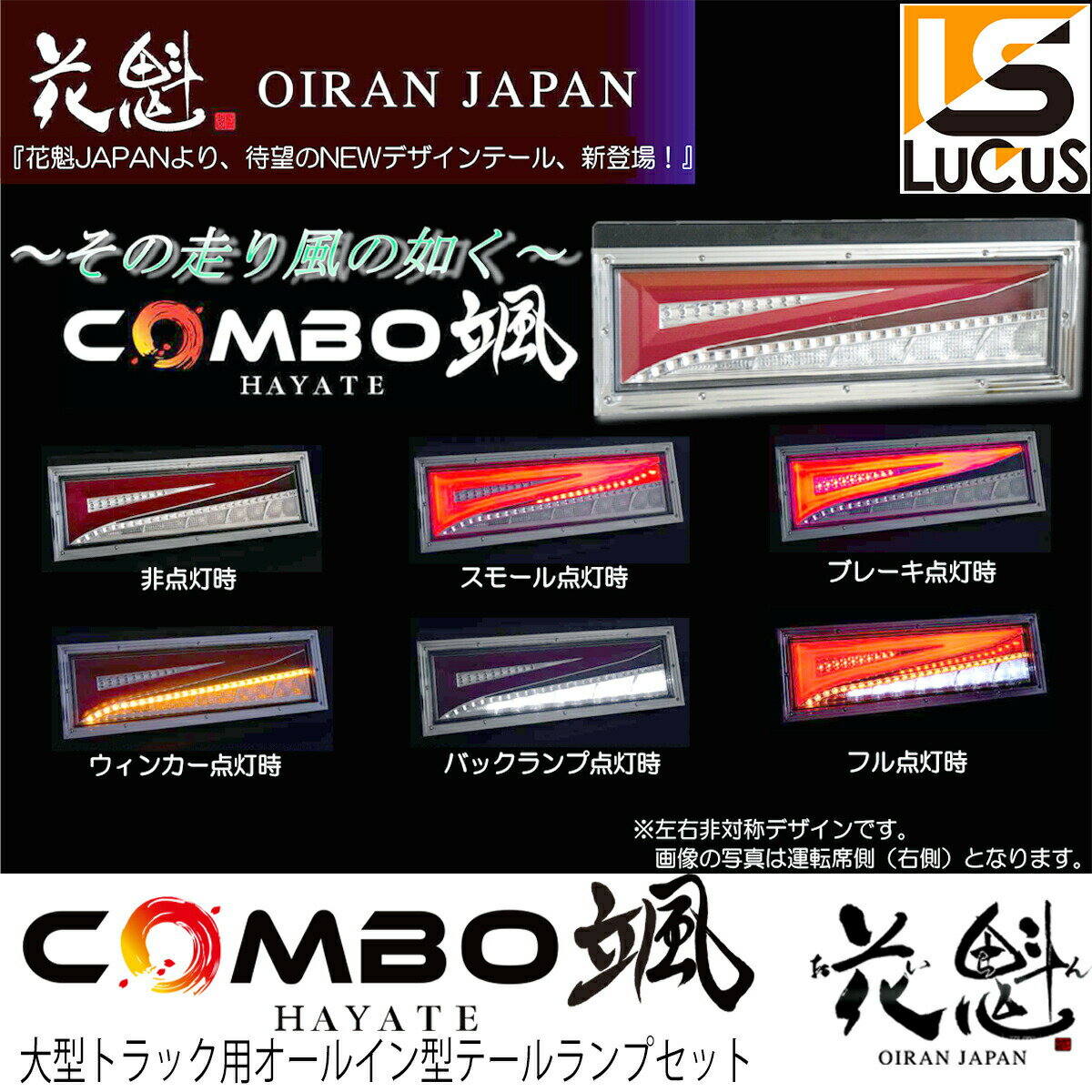 商品詳細商品名COMBO 颯 シーケンシャル LED テールランプ 24V 左右セット トラック 汎用ブランド花魁 JAPAN適合車種・日野:デュトロ 小型/レンジャー 中型/プロフィア 大型※新型「プロフィア」は純正LEDの為、4連抵抗器無しでもOK・三菱ふそう:キャンター 小型/ファイター 中型/スーパーグレート 大型※新型の「スーパー グレート」は緊急停止機能搭載の為、花魁COMBO零のシーケンシャル設定はX(スタンダードタイプはOK)※緊急停止機能…急ブレーキ時にブレーキランプとともに、ハザードランプを点灯する機能・UDトラック:カゼット 小型/コンドル 中型/クオン 大型・いすゞ:抵抗器不要・上記OEM車両商品内容純正テールランプよりもサイズが大きく、視認性向上により安全性をアップさせます法改正により日本国内でも保安基準適合となった「シーケンシャルウィンカー」を採用配線の接続を一部変更することで、「流れる」「流れない」の設定可能ですサイズ写真4枚目のご参照くださいメーカー保証保安基準適合・1年保証(テール本体以外の保証、営業保証・損害保証などは含まれません)商品説明中大型トラック汎用取付車種によっては別売の4連抵抗 OERO-04Nをご購入ください本製品をご使用時に発生したいかなる事故や損傷損害営業保証など一切の責任は負いかねますこの商品のお問い合わせ番号SP-10001379