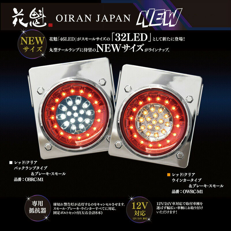 商品詳細商品名花魁JAPAN 32LED テールランプ ウインカー バックタイプ レッド クリアブランド花魁 JAPAN型番OWRC-M1OBRC-M1適合車種12V/24V トラック用付属品・本体取付用 固定ブラケット ボルトナットセット・テールランプ連結用 ステンレスボルトセット・側面取付用 反射板商品説明【花魁32LED】花魁46LEDがスモールサイズの32LEDとして登場!花魁46LEDより一回り小さく、12V車&24V車対応となることで大型車から小型車まで、スペースに制限のある車両にも幅広くご使用いただける製品となっております。【カスタマイズテールランプ】お好みの組み合わせで個性をアピールできます。※組み合わせによって保安基準不適合となる場合がございます。お取り付け前にご確認ください。【寸法】横125mm×縦143mm×奥行62mm(メッキカバー込)【水漏れ点灯不良1年保証】本製品は、熱圧着方式を採用することにより、水漏れを防止し、製品の耐久性を格段に向上させました。※テールランプ本体以外の保証(営業保証・損害補償など)は含まれません。【保安基準適合】保安基準適合製品です。※本製品には反射板が装備されておりません。別途反射板を取り付けてご使用ください。【ECE認証】「ECE認証」とは世界基準の規格であり、数多くの試験をクリアし認証を受けると、「Eマーク」を製品に刻印することができます。「Eマーク」の刻印がある製品は保安基準に適合しており、すべての花魁テールランプはこの認証を取得している保安基準適合品です。※取付個数、取付位置、取付方法によっては車検不適合となる場合がございます。お買い求めの販売店・ディーラー・取付工場などでご確認ください。保証本製品は、1年間のメーカー保証付きです。注意事項本製品は、車種により球切警告灯が点灯する場合があります。その場合、別売りの4連抵抗器(品番:OER0-32N(12V車))(品番:OER0-46N(24V車))を取り付ける事でキャンセルができます。※花魁シリーズ全商品は、取付箇所、個数等によっては保安基準適合とならない場合がありますので、お買い求めの販売店・ディーラーまたは取付工場などでご確認下さいこの商品のお問い合わせ番号SP-20240314-1