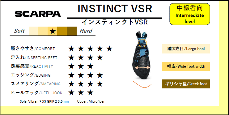 【インスティンクトVSのソールを柔らかめのビブラムXSグリップ2に変更】SCARPA INSTINCT VS R インスティンクトVSのソールを、柔らかめのビブラムXSグリップ2に変更したモデル。柔らかめのシューズを好む方にお勧めです。 材質:マイクロファイバー ソール:ビブラムXSグリップ2 3.5mm 重量:230g(#40、1/2ペア) カラー:ブラック/アズール ※当該製品につきましては、両足内側の皮部分に1〜2mm程度のパンチ穴が開いておりますが、 製造過程にて固定及び位置決めの為つけられたものであり、製品不良ではありません。 足の実寸(cm) 22.523.0 23.524.024.525.025.526.026.527.027.5 当商品の対応サイズ/EU 37.538 38.53939.54040.54141.54242.5 ★足の実寸は、「素足の状態で最も長い足指の先端から、踵の中央までをメジャーで計測した直線距離」を意味しています。 ★足の実寸に対する対応サイズは、弊社独自に調べたものです。メーカー公表サイズとは異なりますのでご注意ください。 ★モニタリングは、弊社スタッフが行っています(足の実寸26.0cm・足囲24.3cm(ワイズ:D やや細身の足型)クライミング歴3年) 足形やワイズによって、対応サイズは異なる可能性があります。また、フィット感覚は個人差があります。上記対応表は参考程度にお考えください。 (メーカー公表サイズ対応表とは異なります。スタッフが独自に調査したものです。) 【スタッフ・インプレッション】 インスティンクトVSとの比較では、確かにソールはこちらのVSRのほうが薄くてやや柔らかく、「ビブラムXSグリップ2」なだけに ソールには粘性がありグリップ力がある。つまり、石灰岩やチャート等の滑りやすい岩向きであろう。 しかしながらソールがやや薄いということは摩耗が早いということでもあるので、靴の寿命は当然ながら短くなる。 それとは別に、同じサイズで比較しても、VSRのほうが履いた感じがやや痛くてタイトに感じる。 この靴では41がベストフィット。SCARPA (スカルパ)
