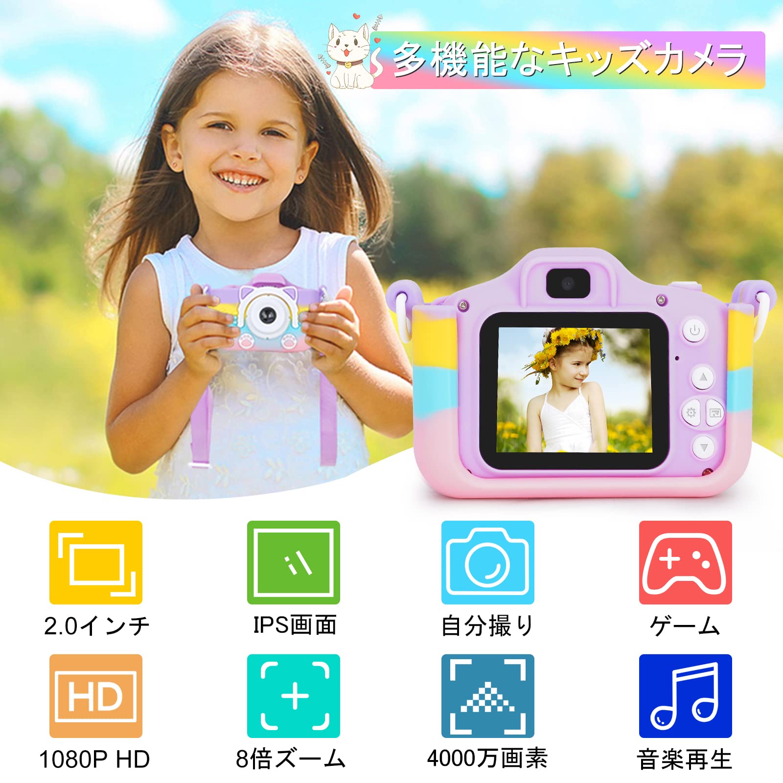 商品情報商品の説明主な仕様 ?【2.0インチIPS画面&高解像度デジカメ】2.0インチIPSディスプレイで、子供の手によりデザインし、落ちにくいです。32GBカードを搭載しているので、約14,000枚の写真を撮ることができます。前後4000万画素カメラ付き、8倍のズームを搭載し、写真解像度7344X5504、ビデオ解像度1920X1080、1080P HD 画面で、完璧な撮影ができます。フロントとリアのデュアルレンズにより、自分撮りが簡単にできます。ワンタッチのシャッター操作で簡単に綺麗な写真が撮れます。br?【多機能なキッズカメラ】写真を撮るだけでなく、いるいるな機能も付けでおり、タイミング写真、再生、ゲーム、フォトステッカー、音楽再生、連続撮影、セルフィー、ビデオなどがあります。 操作画面は日本語対応し、それに、6種類写真フィルターと5種類面白い分割画面のほかに、28種類のフレーム機能がある綺麗な写真を撮ることができます。子供たちにカメラの魅カを感じさせ、幸せな時間を作られましょいう。br?【850mAh大容量電池&32GB TFカード】ミニカメラは850mAh大容量バッテリーが内蔵しており、USBケーブルで充電でき、フル充電は約2-3時間となり、4-5長時間で働きます。パソコンにも接続でき、画像とビデオが簡単に転送されます。とても便利です。それに、32GのTFカード付きで、写真約14,000枚撮れております。生活の美しさを発見するのを助けて、人生の美しい画面を記載された。br?【ユニコーンケース&財布】環境に優しくて柔軟な有機シリコンケースが付いており、耐衝撃性が高い、衝撃と落下でも壊れにくく丈夫です。ストラップも付属し、本体はわずか63gでコンパクトなミニトイカメラ(33*40*50mm)なので持ち運び便利、様々な場所に使えます。 ユニコーン財布:子供向けの最もホットなユニコーン要素のデザイン、サイズ-約14.5 x 10.5 x 1cm、超柔らかいプラッシュ生地で作られた調節可能、格納式ストラップで、あなたの小さな王女を群衆の中で際立たせます。br?【プレゼントに最適】本トイカメラは日本語取扱説明書が付きなので、読みやすい、そして、多種多様な用途。子供の誕生日、旅行、入学、クリスマス、新年、パーティーのプレゼント、お花見、ハイキング、運動会など色々な場合に最適のプレゼントとしてオススメです。 ご注意:フリーズや黒い画面がある場合、 付属した製品マニュアルをよくお読みになり、カメラをリセットしてから電源を入れてください。シャットダウンの原因がバッテリー不足ではないことを確認してください。