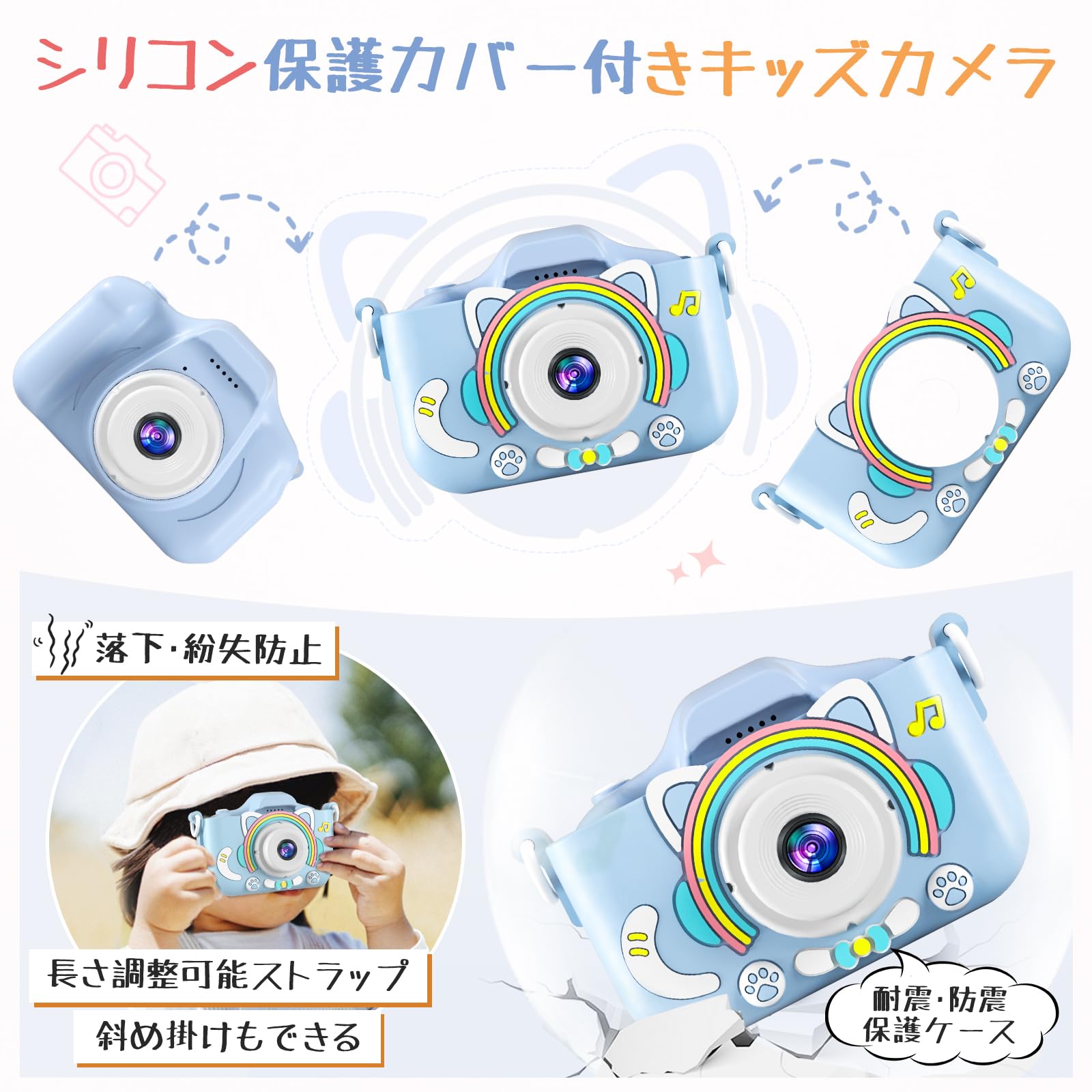 商品情報商品の説明主な仕様 ?Easylife JP(全品保証あり)店舗だけ純正品を販売しております。購入する前に、販売元をご確認くださいませ。【画面明るさ調整機能&保護用シリコンケース付属】2024年たくさんの子供に愛用されている最新型人気虹猫デザイン、目に優しい2.0インチIPSスクリーンの上に弊社独自開発の画面明るさ調整機能で子供へ幼児用カメラの楽しさを提供しながら視力を守ってくれます。使用環境によって画面明るさを1から8まで調整できます。Yoaio子供用カメラは安全基準を備えた環境に優しい耐衝撃性、耐久性の素材を使用し、少しの衝撃や落下に傷つけない落下防止かわいいシリコンケースを付いてあります。キッズ カメラ本体はわずかの104g、大人のお手の平ぐらいのサイズで、子どもがどこにでも持ち歩き便利です。br?Easylife JP(全品保証あり)店舗だけ純正品を販売しております。購入する前に、販売元をご確認くださいませ。【ひらがな操作パネル内蔵&ひらがな説明書付き】Yoaioトイカメラは子供が自分で操作できるようにひらがなとカタカナで表示する操作画面とひらがな表記の専用説明書を用意しております。ひらがなが読めば、パパやママに聞くなくても、子ども一人でも簡単にカメラを操作できます。キッズカメラに英語、韓国語、中国語、イタリア語、ドイツ語、フランスなど12各種言語が内蔵し、電源&画面自動オフの省エネ子供向けの設定になっています。この子供 カメラはダウンロード可能な英語マニュアルもあり、2歳から9歳、世界の男の子や女の子への誕生日、クリスマス、旅行、入学、パーティー、新年などに理想的なプレゼントです。br?Easylife JP(全品保証あり)店舗だけ純正品を販売しております。購入する前に、販売元をご確認くださいませ。【前後レンズ付き&多機能 高画質キッズ カメラ】子ども カメラのフロントとバック両方にHD レンズがあり、他撮りはもちろん、自撮りもできます。撮影以外に録画、パズルゲーム、音楽など多機能が内蔵し、撮影以外のゲームと音楽機能はお出かけや長旅の際、静かにしてくれる暇潰しで活躍できます。カメラは目の視力を守ってくれる2.0インチ IPSディスプレイを採用し、1080HD 4000W画素よりグレードアップした4800W画素のレンズを搭載し、8倍までズームできる性能で市販より高画質の子供用デジタルカメラを実現しました。撮影モードには28種類ステッカーとフレーム、6種類フィルム、10種類ミラー効果があります。ワンタッチで撮影効果を切り替え、子供が消防士、姫様、王子様や看護師になり切れ気分、子供なりに簡単に面白く撮影できます。動画をフィル—効果を付けて撮ったり、加速再生にしたり、スロー再生にしたりでき、楽しさは倍増になります。br?Easylife JP(全品保証あり)店舗だけ純正品を販売しております。購入する前に、販売元をご確認くださいませ。【汎用type-c充電&長さ調整可能のストラップ】汎用性のtype-cケーブルが付属しているので、充電ケーブルを失くして別途購入する心配は要りません。撮った写真や動画はUSB A-type cケーブルでカメラとパソコンに繋ぎ、パソコンから大画面で見られます。子供がミニカメラを首に掛けられたり、斜めにかけられたり設計された持ち運びに便利な耐久性のあるストラップも付いてあります。800mAh大容量リチウム電池を内蔵し、写真や動画を3時間撮影できます。32GBメモリーカードが付属し、8500枚ぐらいの写真を保存できます。レンズ保護の巾着袋も付いてあり、カバンに収納する時にレンズに傷付けたりする心配は要りません。*充電時は付属充電ケーブルと5V/1Aの充電器をご利用ください。バッテリ性能を保つために、5V/1A以上の充電器をご利用しないでください。長く充電しっぱなしないで、最大2時間以内にお控えください。br?Easylife JP(全品保証あり)店舗だけ純正品を販売しております。購入する前に、販売元をご確認くださいませ。【1年あんしん保証&ローカルアフターサービス対応】子ども カメラは一つ一つ丁寧に品検されてから出荷しております。商品について質問がありましたら、24時間に日本ローカル対応できるスタッフはいつでもご連絡をお待ちしております。梱包内容:小さいカメラ本体*1、32GB SDメモリーカード*1、カードリーダー、type-c充電ケーブル*1、ストラップ*1、リセットピン*1、日本語ひらがな説明書