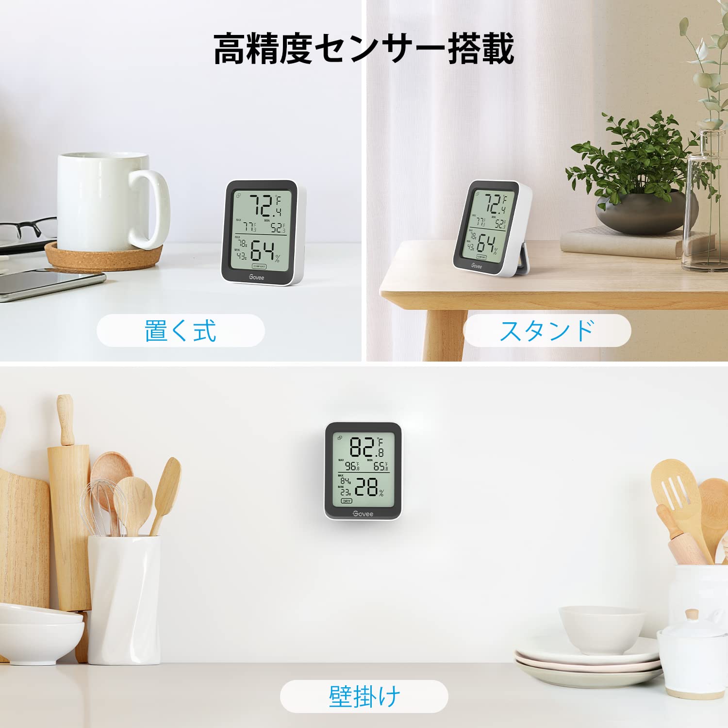 商品情報商品の説明主な仕様 【Bluetooth接続・遠隔確認】Govee Bluetooth温湿度計は「Govee Home」アプリで温湿度を最大 80m遠隔確認できます。温湿度計に近づく必要はなく、気軽に温湿度情報がスマホで読取れます。また、インフルエンザや乾燥、梅雨時期のカビ予防にもお役に立ちます。br【コンパクト・LCD画面】LCD画面にリアルタイムの温度・湿度測定値と最大・最小記録が示され、快適度も3段階で表示でき、一目でお部屋の温湿度と快適さが把握できます。梅雨季節のカビ対策や赤ちゃんの健康管理、熱中・カビ対策にとって頼もしい相棒です。br【高精度センサー搭載】スイス製のSHT30センサーを内蔵し、温度は最大±0.3°C、湿度は最大±3%RHの誤差で 、高精度で信頼性の高い温湿度測定を実現できます。また、2秒ごとにデータを更新し、精度と感度両方とも優れているデジタル温湿度計です。br【温湿度アラート通知機能】アプリで設定された温湿度範囲を超えると、Bluetoothの通信範囲でアプリからアラート通知が届きます 。風邪や乾燥、カビなどの予防目安として活躍して、赤ちゃんがいる家庭やペット(犬、猫、うさぎ、爬虫類など)のいる家庭におすすめです。br【履歴データ確認&データエクスポート】アプリに過去60日間(二ヶ月)のデータは保存できます。また、温度・湿度がグラフで可視化し、特定時刻の履歴データの確認が可能です。データ(CSVファイル)をエクスポートでき、お自宅の温湿度変化を確認できます。