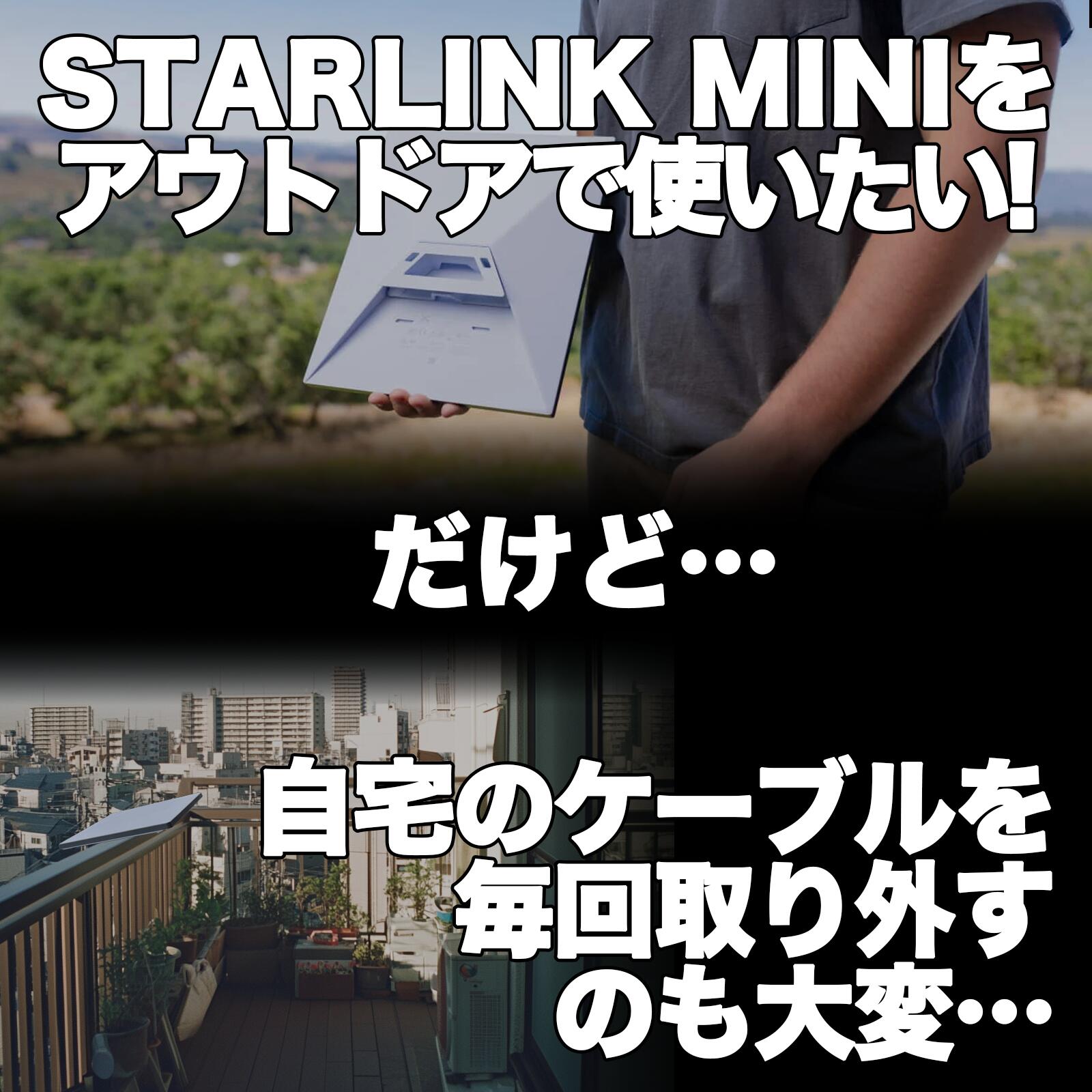 4種類の長さからお選び頂けます。 長さ:2m,3m,5m,10m/端子:USB-C型 屋外に設置するアンテナのため防水性と抜けにくさに考慮した設計となっております。そのため少し取り付けが硬くなっておりますがご容赦ください。 ブランド:サクラガレージ コネクタタイプ:USB Type-C ケーブルタイプ:USB コネクタタイプ:オス-オス ピン数:24旅行にもアウトドアにもSTARLINK MINIを持ち出そう! ご自宅でSTARLINK MINIをご利用され始めている方も多いかと思います。やはり旅行やキャンプなどでもSTARLINK MINIを使ってみたいですよね?そんな時にはぜひこの持ち運び用給電ケーブルをお使いください。 自宅のSTARLINK MINIをアウトドアに持ち出すのは大変・・・ スマホを見ながらアンテナの向きを決めて、ベランダなどに固定し長いケーブルをはいまわし、、、と最初だけとはいえ設置に少しコツがいるSTARLINK MINI。キャンプや旅行のたびにいちいちケーブルを外して持っていくのは大変な作業です。 さらに、本体付属のあの長いケーブルも持ち運ぶにはちょっと、、、 付属ケーブルは自宅のベランダや屋根などに設置するには最適ですが、キャンプや旅行などに持ち運ぶにはやや重くてかさばりますよね。また、専用のACアダプタも一緒に持ち歩く必要もあり、どうしても荷物が多くなってしまいます。。。 そこで、持ち運び用の専用給電ケーブルを! 持ち運びを想定し細さと性能を両立しました USB-CタイプにはPDチップを、シガーソケット型にはヒューズをそれぞれ内蔵 ケーブルは2m,3,5,の3種類、コネクタはUSB-Cとシガーソケットの2種類 キャンプに旅行に、もちろんご自宅に、適切な長さのケーブルをお選びください