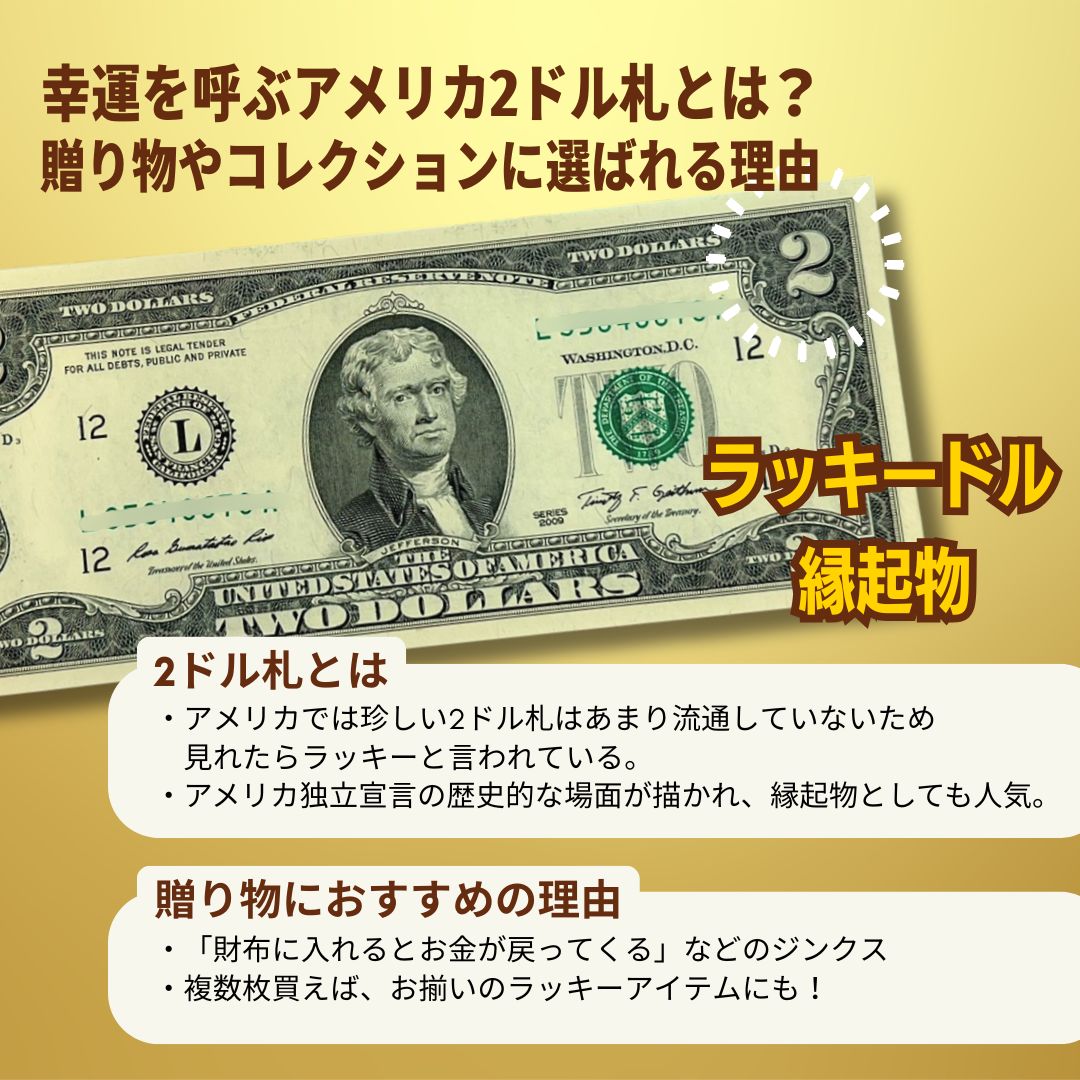 商品名 アメリカ 2ドル紙幣 未流通 L ピン札 レア感 発行自体はされていますが、実際にはほとんど流通しておらず、 持っていると珍しがられることが多く「運がいい」と言われています。 金運アップのお守りに アメリカでは「2ドル札を財布に入れると金運が上がる」とされており、 縁起物としてプレゼントにも大変人気があります。 ツキを呼ぶ「2ドル」 「2」は「つながり」や「良縁」を意味する数字とも言われ、 ポジティブな意味を込めて贈られることもあります。 連番・未使用品 ピン札・未使用の状態、さらに連番であれば、 「運が続く」「始まりが美しい」として、より縁起が良いとされています。 状態 未流通 / シリーズL / ピン札(未使用)アメリカ 2ドル紙幣 幸運アップ