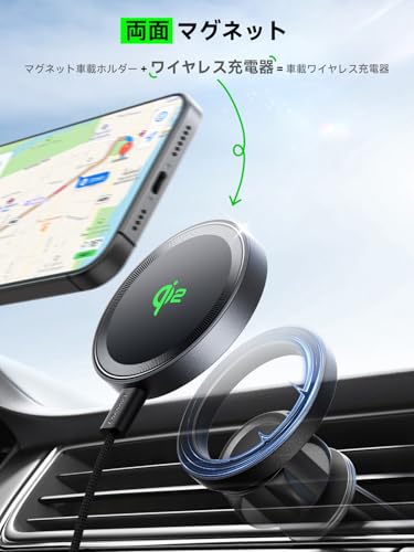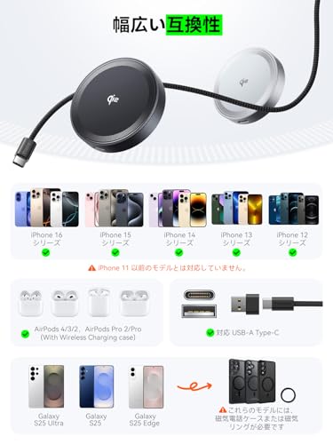 THREEKEY ワイヤレス充電器【Qi2 PSE 公式認証】15W超低温 MagSafe充電器 両面マグネット式 マグセーフ充電器 1:1適合 强磁気 iPhone 16/15/14/13/12シリーズ/Galaxy S25 Ultra対応 60W+1.5m高耐久編み込み式ケーブル デュアルUSB-A/C入力ポート
