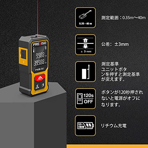 PREXISO レーザー距離計 電子距離計 距離測定計 ミニ 40M PSC認定取得 コンパクト 高精度 USB充電式 6種測定モード 距離 面積 体積 ピタゴラス測定 連続測定 自動計算 操作簡単 日曜大工 家庭 建設現場 土木現場の室内測定 イェロー