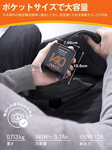 Vマウントバッテリー, 140wh/9700mAh Moman Power 140 14.4V 大容量 機内持ち込み可能 PD3.0 65w USB-C/BP/D-TAP 713g コンパクト 動作温度-20℃~50℃ 総出力150W,大容量バッテリー-Vマウント-大容量バッテリー-急速充電