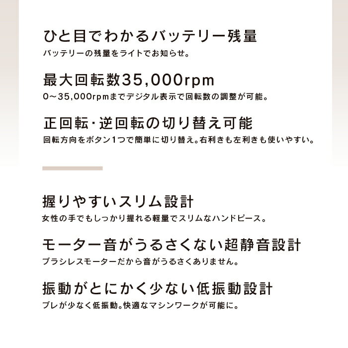 商品説明 <高性能でハイパワーなブラシレスモーター搭載> 従来のモーター内部には、「ブラシ」と呼ばれる電極があり、これを接触させてモーターを回転させる仕組みでした。ポータブルネイルマシンに搭載しているモーターはブラシが無い構造になっており、高性能・ハイスペックなネイルマシンが完成しました。 <ブラシレスモーターのメリット> ■耐久性の向上ブラシの摩擦による負荷が軽減され、耐久性が上がります。またブラシが無いことで密閉率が高くなり、ダストが入りにくい構造となっています。ブラシ交換の必要もなく、メンテナンスが軽減されます。 ■低振動・超静音 従来のブラシタイプのモーターは、ブラシの接触によりモーターを回転させていました。このため音が大きく、振動もかなりありました。 ブラシレスでは当然、音も振動も軽減されます。また、ブラシタイプでは負荷によっては回転が不安定になることがありますが、ブラシレスモーターは負荷が変化しても、低速から高速まで安定した速度を維持することができます。 ■熱を持ちにくい ブラシタイプに比べ、ブラシレスタイプはモーターの効率が格段に良くなりますので、発熱しにくい構造になっています。 <その他の特長> ●4-5時間充電で最大20時間の無負荷稼働 ●最大回転数35,000rpm ●正回転・逆回転の切り替え可能 ●ハンドピースが握りやすいスリム設計 ●超静音設計でモーター音も気にならない ●低振動だから軸ブレにくい ☆1年間の保証付き※日本国内のみ有効 仕様 ●電圧:12V/1.5A ●消費電力:18W ●入力電圧:100V-240V 50/60Hz ●回転数:0〜35,000rpm ●対応軸径:φ 2.34mm ●充電時間:6時間 ●無負稼働時間:最大10時間 <サイズ> ●コントローラー:縦140x横75x高25(mm) /235g ●ハンドピース(ケーブルを除く) :長さ136x径18(mm)/128g 仕様 ●消費電力:36W 入力:100-240V 50/60Hz 1.0A 出力:24V 1.5A ●幅150mm奥行150mm高さ85mm/重さ390g ●ジェルオフマシン1台/専用アダプタ1個/説明書・保証書1枚 使用上のご注意 予めご了承ください。 メーカー名 ■販売元/株式会社ワールドビューティワークス ■TEL:075-956-7700 広告文責 ■GRACIA■TEL:075-204-0219