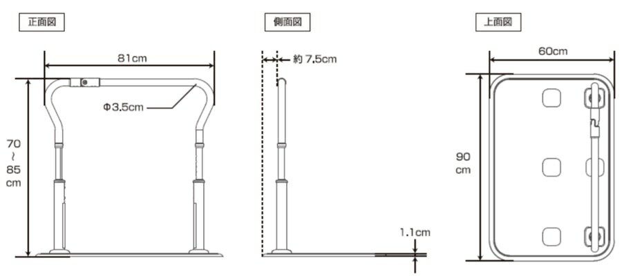 ●型番/XPN-L80801 ●サイズ/ベース部:幅60×奥行90×高さ1.1cm、手すり部:幅81×高さ70〜85cm(2段階)、手すり径:φ3.5cm ●重さ/22kg ●最大使用者体重/100kg ●材質/ベース・支柱:スチール、手すり:塩化ビニル樹脂(被膜部)・アルミニウム(芯材・ジョイント)、ベース縁ゴム:塩化ビニル樹脂、カーペット:合成繊維、支柱カバー:エラストマー ●生産国/日本 ●特徴/ ・両足が乗る広々スペース ・端から端まで掴みやすく安定 ・なだらかな傾斜でつまずきにくい