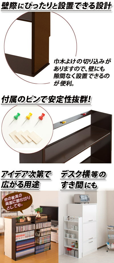 ■コミック本棚 おしゃれ 幅45cm 極スマート ウォールラック おしゃれ ホワイト 白 ブラウン 奥行15センチ 棚 シェルフ 本棚 スリム省スペース 薄型本棚 コミック■薄型のミニラック。壁や家具のサイドや裏面等様々なシーンに使える便利もの。巾木よけ加工もされているので壁にぴったり設置できます。壁に溶け込む程の薄型で場所をとらず、インテリアに最適な逸品。カラーはホワイト・ブラウンの2色、CDやコミック等も収納できる薄型、マガジン等ディスプレイ感覚で収納できる超薄型の2タイプ、幅2サイズの計8種類をご用意。カラフルな押しピンで止めるだけの簡単設置。■ 商品仕様本体:スチール(エポキシ樹脂粉体塗装)耐荷重/棚板:約3kg壁や家具に設置できる超薄型設計※ピンで止めるタイプです。事前に設置場所にピンを指すことが出来るか・指しても良いかご確認下さい。 商品重量:4kg日本製■ 商品サイズ本体:約幅45×奥行14×高さ90.5cm収納部内寸:約幅42×奥行12×高さ(最上部)10(その他)19cm巾木よけ:約幅1×高さ10cm梱包サイズ約:幅94×奥行62×高さ15cm■ 組立て完成品■ 備考商品画像は色合いや素材感が実際の商品と異なる場合がございます。モニター・ディスプレイによっても写り方が変ります。予めご了承ください。w-60:h-90 コミック本棚 極スマート おしゃれ ブックラック 窓下収納 シェルフ 本棚 スリム省スペース 整理棚 DVDラック完成品コミック本棚 ホワイト 白 ブラウン 茶 スリムラック 北欧家具 おしゃれ シンプル 奥行15センチ棚 省スペースな奥行き15cmの薄型本棚 奥行が約15センチ 棚 スマートな奥行15センチ棚 コミックラック 4段 コミックラック ホワイト コミックラック スリム 本棚 スリム スチールラック 幅45 窓下 壁掛け 薄型 すき間 トイレ 本棚 コミックラック 日本製 完成品 白 ホワイト ディスプレイ 幅45 来客スペース 待合 子供 漫画 文庫 壁面組立不要 組み立て不要※ピンで止めるタイプです。ご購入前に設置場所にピンを指すことが出来るかご確認下さい。 ■超薄型 スチールラック バリエーション■ マガジンラック 幅45cm マガジンラック 幅59cm トイレラック コミックラック 幅45cm コミックラック 幅59cm 画像をクリックするとその商品ページに移動します。 ■壁掛けラックシリーズ バリエーション■ ウォールラック3枚セット 幅40cm 棚付きウォールミラー 幅40cm マガジンラック2枚セット 幅26cm マガジンラック2枚セット 幅60cm 画像をクリックするとその商品ページに移動します。