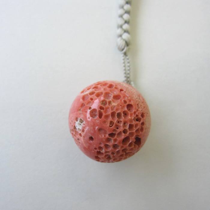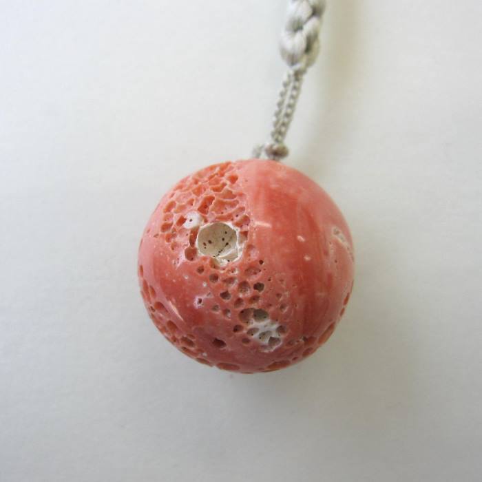 商品説明珊瑚の種類桃珊瑚 サイズ大きさ:直径約26ミリ金具:SILVER紐:正絹重さ(金具・紐付き):19g商品説明(特徴など)寄生虫による穴があり、「マキ」や「す」など、自然素材ならではの独特の風合いが美しい桃珊瑚のす玉です。 1点ものの希少な根付です。 天然珊瑚は魔除けや厄除けといわれ持つ人のお守りとなります。 ペンダント用金具が付いていますので、紐を外してペンダントトップとしてもお使いいただけます。備考 *天然の「す」「マキ」「穴」「キズ」等が見られますので、ご了承下さい。※【メール便不可】