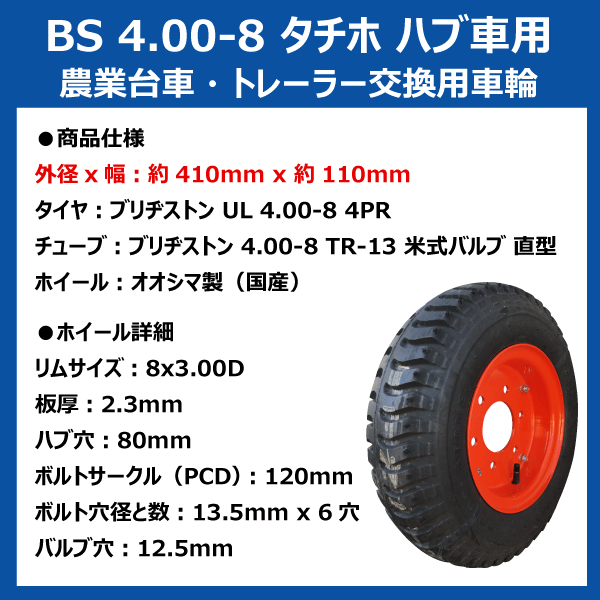 4.00-8 タチホ 2本セット 6x4 ハブ トレーラー 台車 ハブ車 PCD120 ハブ穴80 ブリヂストン タイヤ チューブ 国産ホイール 400-8 4.00x8 400x8 タイヤ・チューブ・ホイールセット(※沖縄・離島は発送不可)