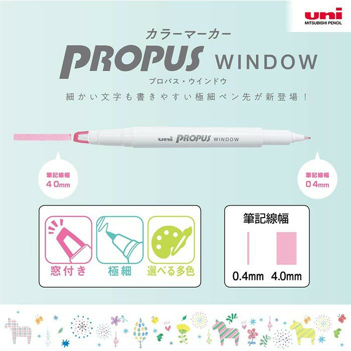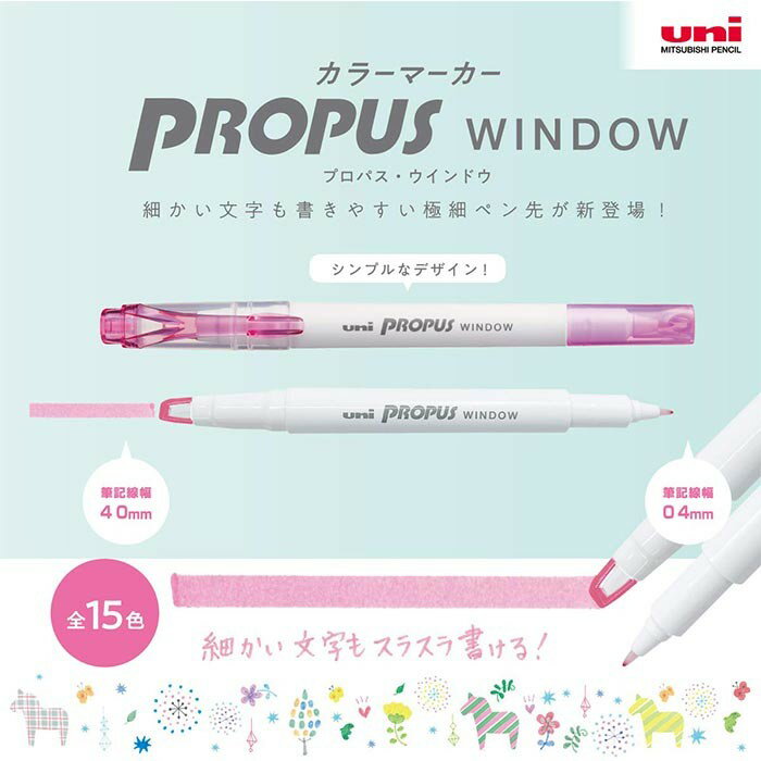 【商品特長】■細く、文字書きに適した極細のペン先文字を目立たせるマーキング用途の窓付きペン芯と、アンダーライン、文字書き用途にも適した極細タイプのプラペン芯のツインタイプです。従来の細字(0.6mm)フェルト芯を、より細くした極細(0.4mm)プラペン芯に変更することで、アンダーライン用途だけでなく、文字書き用途にも適した、マーキングペンとしても文字書き用のカラーペンとしてもお使いいただけるようになりました。商品名:プロパス・ウインドウ 5C品 名:PUS-103T 5C(ベーシックカラー)/PUS-103T 5C2(ライトカラー)/ PUS-103T 5C3(スモークカラー)インク色:ベーシックカラー:レッド、ピンク、グリーン、ブルー、ブラックライトカラー:ライトピンク、ライトイエロー、ライトグリーン、ライトブルー、ライトバイオレットスモークカラー:スモークレッド、スモークオレンジ、スモークグリーン、スモークブルー、スモークグレー筆記線幅:4.0mm(太字)/0.4mm(極細)価 格:5色セット 本体価格 500円 + 消費税ブランド:三菱鉛筆