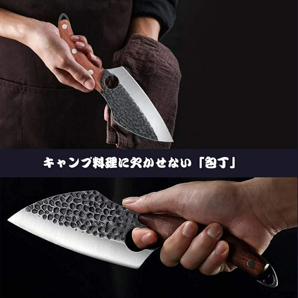 商品情報 商品説明 【商品情報】 【商品情報】全長:24.5cm 刃体長さ:14cm、刃の厚さ:5mm ブレード素材:高炭素鋼 ハンドル素材: 天然木 重量:277.4g 硬度:58-59HRC 【狩猟解体包丁】職人の手によって丹念に仕上げられた、高い性能と高級感を備えた本出刃包丁。刃には「高炭素鋼」と「58 HRC鋼」が使用され、鋭い切れ味が特徴です。ズシリと重量感があり、硬度も高い厚手刃なので、堅い骨も叩き切れます。魚をさばくだけでなく、骨付き肉の料理にも適したモデルです。 【 フルタング構造】肉の解体などに大変便利な包丁は、切れ味は勿論、操作性を追求したデザインです。柄は刃から柄の先までの一体型となっており、持ち手の部分には両側から天然木を使用。丸みがあり、握りやすく力を加えやすいです。ハンティング、フィッシング、キャンピングなど、様々な場面で活躍してくれる万能ナイフです。 【 本革シース付き 】付属の革シースにはベルトループが付いていて、幅7mmサイズまでのベルトに通せるので、腰に下げて持ち歩くことが可能。 【ご注意】正当な理由なくこの商品を携帯することは法令により禁止されております。 18歳未満の方はこの商品を購入しないようお願いします。 お子様の手のの届かない安全な所にきちんと保管してください。