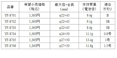 余浮力が小さい高感度タイプ 【使用電池】 パナソニック リチウム電池BR425・BR425×2 【電池寿命】 連続約8時間(電池1本使用の場合約5時間) 【発光部】 高輝度LED(チップ型)×2【注意】掲載中の商品は全ての在庫があるわけではございません。メーカー取り寄せ商品もあります。場合によってはお届けできない事もあります。 掲載画像はシリーズの代表画像を参考として掲載してます。 必ずしも商品名と一致しませんので、予めご了承下さい。