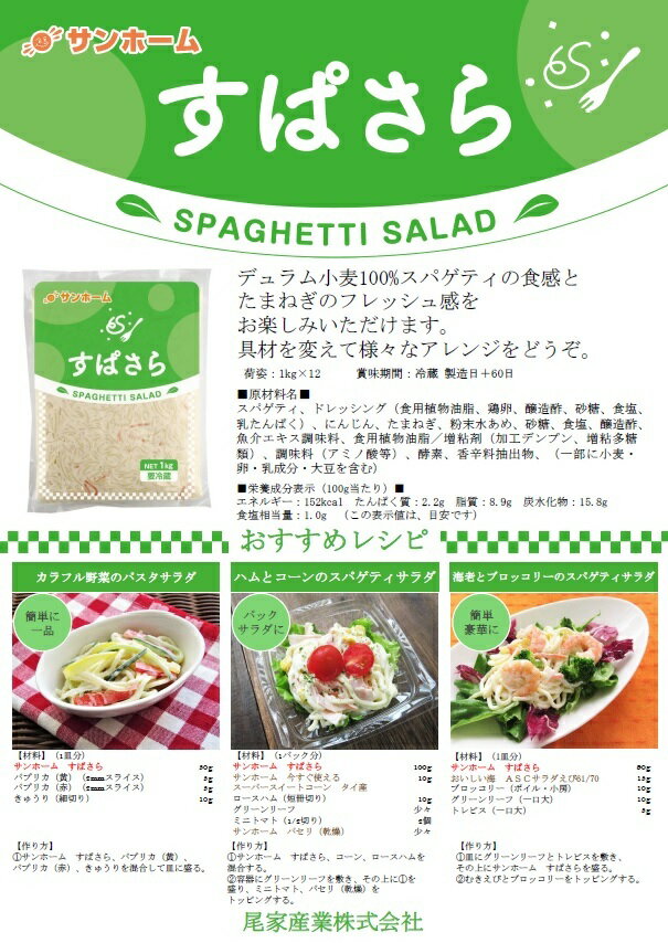 商品情報名称サラダ原材料名スパゲティ、ドレッシング(食用植物油脂、鶏卵、醸造酢、砂糖、食塩、乳たんぱく)、にんじん、たまねぎ、粉末水あめ、砂糖、食塩、醸造酢、魚介エキス調味料、食用植物油脂/増粘剤(加工デンプン、増粘多糖類)、調味料(アミノ酸等)、酵素、香辛料抽出物、(一部に小麦・卵・乳成分・大豆を含む)内容量1kg賞味期限別途商品ラベルに記載保存方法冷蔵(1〜10℃)で保存してください。販売者尾家産業株式会社 大阪府大阪市北区豊崎6-11-27備考クール(冷蔵)便のお届けとなります。【業務用スパゲッティサラダ】サンホーム すぱさら 1KG チルド 冷蔵 サラダ おかず 惣菜 洋風 マヨネーズ スパゲッティー 小鉢 副菜 お弁当 業務用 総菜 お取り寄せ グルメ ランチボックス 大容量 パスタ サラダ おいしい サラダを手早くお手軽に! デュラム小麦100%スパゲティの食感とたまねぎのフレッシュ感をお楽しみいただけます。具材を変えて様々なアレンジをどうぞ。 12