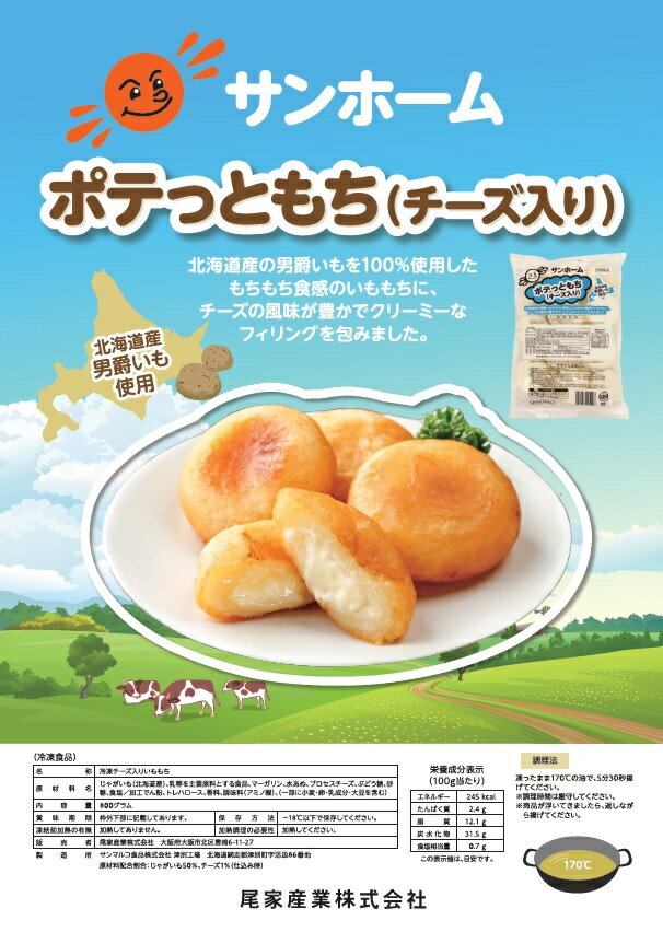商品情報名称冷凍チーズ入りいももち原材料名じゃがいも(北海道産)、乳等を主要原料とする食品、マーガリン、水あめ、プロセスチーズ、ぶどう糖、砂糖、食塩/加工でん粉、トレハロース、香料、調味料(アミノ酸)、(一部に小麦・卵・乳成分・大豆を含む)内容量800g賞味期限別途商品ラベルに記載保存方法−18℃以下で保存してください販売者尾家産業株式会社 大阪府大阪市北区豊崎6-11-27備考クール便のお届けとなります。【北海道産男爵いも使用】サンホーム ポテっともち(チーズ入り)40gX20個冷凍 いも餅 じゃがいも ポテト 芋 チーズ 大容量 惣菜 おやつ こども 子ども おつまみ 北海道 男爵 もちもち 酒のつまみ プロ食材 居酒屋 ポテトもち 揚げもち あげもち 居酒屋メニューをご家庭で!冷凍の業務用チーズ入りいももちです。 北海道産の男爵いもを100%使用したモチモチ感のあるいももちにチーズの風味が豊かでクリーミーなフィリングを包みました。居酒屋メニューの一品や、テイクアウト、デザートとしてもおすすめです!【調理方法】凍ったまま170℃の油で、5分30秒揚げてください。※調理時間は厳守してください※商品が浮いてきましたら、返しながら揚げてください 12