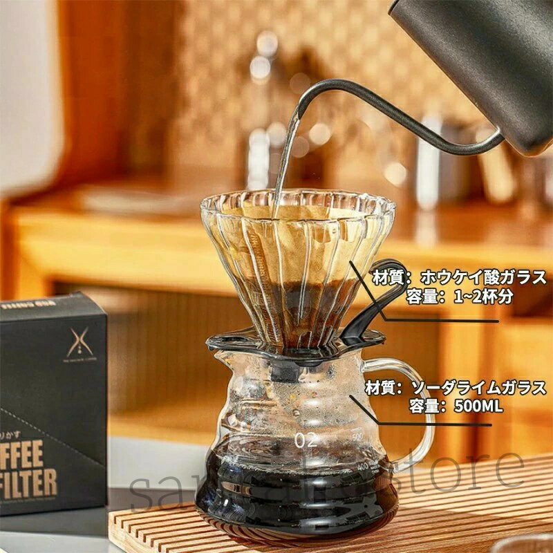 商品情報 商店紹介 【セット内容】 ・コーヒーポット(ステンレス製) ・ガラスサーバー(容量500ml) ・V60ガラスドリッパー(1~2杯用) ・フィルターペーパー ・手挽きコーヒーミル(420ステンレス刃、分解洗浄可) ・コーヒースプーン / 温度計(セットによる) 【素材】 ドリッパー:ホウケイ酸ガラス サーバー:ソーダライムガラス コーヒーミル:木材+ステンレス刃 ポット:ステンレス 【特徴】 ✔ ハンドルを回すことで豆を挽く心地よさと香ばしい香りを楽しめる。 ✔ 420ステンレス刃で錆びにくく、分解して水洗い可能、衛生的。 ✔ ガラス製ドリッパー&サーバーで抽出過程が一目でわかり、淹れる楽しみを演出。 ✔ 持ち運びやすいコンパクト設計で、アウトドアやキャンプ、旅行にも最適。 ✔ 自宅用はもちろん、結婚祝いや新築祝い、コーヒー好きへのプレゼントにも人気。 【使用方法】 1. コーヒー豆を適量すくう 2. 手挽きミルで豆を粉にする 3. フィルターペーパーをセットし濡らす 4. コーヒー粉を入れる 5. ポットでお湯を注ぐ 6. 抽出して完成! 【ご注意事項】 ※ 実際の商品カラーは撮影環境やモニター設定により若干異なる場合があります。 ※ 食洗機の使用はお避けください。柔らかいスポンジで手洗いを推奨。 ※ ガラス製品のため強い衝撃を避けてください。 【おすすめ用途】 自宅カフェ / アウトドア / キャンプ / ピクニック / ギフト