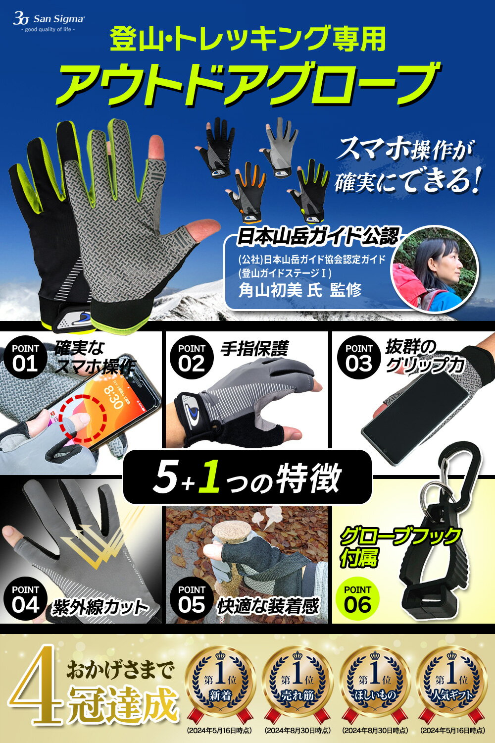 メーカー希望小売価格はメーカーカタログに基づいて掲載しています 商品情報素材/材質■甲側■ナイロン 83%ポリエステル 17%■掌側■ナイロン 100%※滑り止め シリコンゴムカラーグレー/ブラックオレンジ/ブラックグリーン/ブラックサイズ/寸法S 掌幅 7.5cm 掌周り 17~20cmM 掌幅 8.0cm 掌周り 18~21cmL 掌幅 8.5cm 掌周り 21~23cm特長・【スマホ操作&細かい作業が確実にできる】人差し指と親指の先端が露出した指だしフィンガーレスのデザインで、スマホ操作や写真撮影をスムーズに確実に行えます。登山中に解けた靴紐やペットボトルの開閉など細かい作業も確実に行えます。また、登山手袋用だけでなく、釣りにも使えるフィッシンググローブとしても最適です。・【グローブフック付き】ワンタッチで簡単に登山グローブを携帯できるカラビナ付きホルダーが付属しています。山登りの最中や休憩中に一時的に手袋を外した場合にも、引っ掛けてホールドできるので紛失する心配がありません。・【手指をしっかり保護】人差し指と親指の第一関節までの最低限の部分しか指が出ていないので、しっかり手指を保護してくれます。手をついたり、ものをつかんだりする場面が多いアウトドアシーンでも心配ありません。・【グリップ力が抜群】掌にはシリコンゴムによる加工がされているので、しっかりとした滑り止め効果が得られます。スマホやストック(トレッキングポール)、滑りやすい岩肌にもしっかりフィットし、強力なグリップ力を発揮する登山用手袋です。・【UVカット97%】テストセンターにて実施した紫外線遮蔽性テストにおいて、UVカット率99.7%、UPF50++の結果が得られました。紫外線から素肌へのダメージを極限まで軽減してくれます。・【快適な装着感】伸縮性と通気性に優れた素材を採用しているので、春先から夏場、秋のトレッキング時に最適です。また少し汗ばむ場面でも冷感効果があるので、ストレスに感じにくくなっています。その他商品説明・皮膚に異常を感じた場合は、直ちに着用を中止してください。・色物は色移りの恐れがありますので、単体で選択してください。・濃色品は、摩擦(特に汗や雨等で湿った様態)による淡色品への色移りに注意してください。・濡れたまま放置しておくと、色ならびに他の衣類及び持ち物に色移りする原因となりますのでお止めください。関連キーワード登山手袋 トレッキンググローブ アウトドアグローブ 登山用手袋 メンズ レディース 男女兼用 春夏 秋冬 スマホ対応 滑り止め加工 薄手 防滑 速乾 通気性 自転車 ランニング ジョギング ハイキング サイクリング 作業用手袋 ウォーキング 筋トレ キャンプ フィールドグローブ 登山用品 登山グッズ 釣り ブラック グレー おしゃれ 青 緑 橙 モンベル ノースフェイス ワークマン おすすめ 送料無料 送料込み注意モニター発色の具合により色合いが異なる場合がございます。【スマホ操作が確実】 登山 手袋 トレッキンググローブ 登山グローブ 登山用手袋 春 秋 夏 フィッシンググローブ メンズ レディース 兼用 グローブ 登山用品 釣り フィンガーレスグローブ 指だし 指なし手袋 作業用 glove 富士山 防水 100均 富士登山 登山 手袋 トレッキンググローブ 登山グローブ 登山用手袋 春 秋 フィッシンググローブ メンズ レディース 兼用 釣り フィンガーレスグローブ 指だし 指なし手袋 5