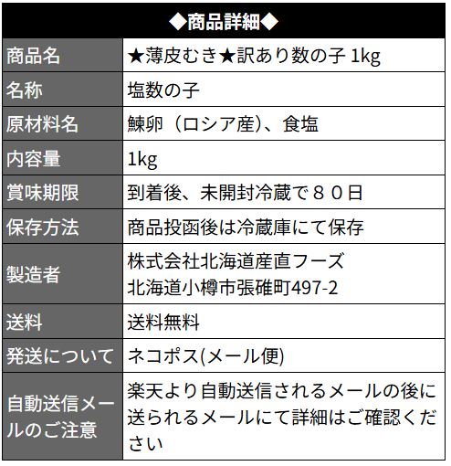 ◆商品詳細◆ 商品名 ★薄皮むき★訳あり数の子 1kg 名称 塩数の子 原材料名 鰊卵(ロシア産)、食塩 内容量 1kg 賞味期限 到着後、未開封冷蔵で80日 保存方法 商品投函後は冷蔵庫にて保存 製造者 株式会社北海道産直フーズ 北海道小樽市張碓町497-2 送料 送料無料 発送について ネコポス(メール便) 自動送信メールのご注意 楽天より自動送信されるメールの後に送られるメールにて詳細はご確認ください