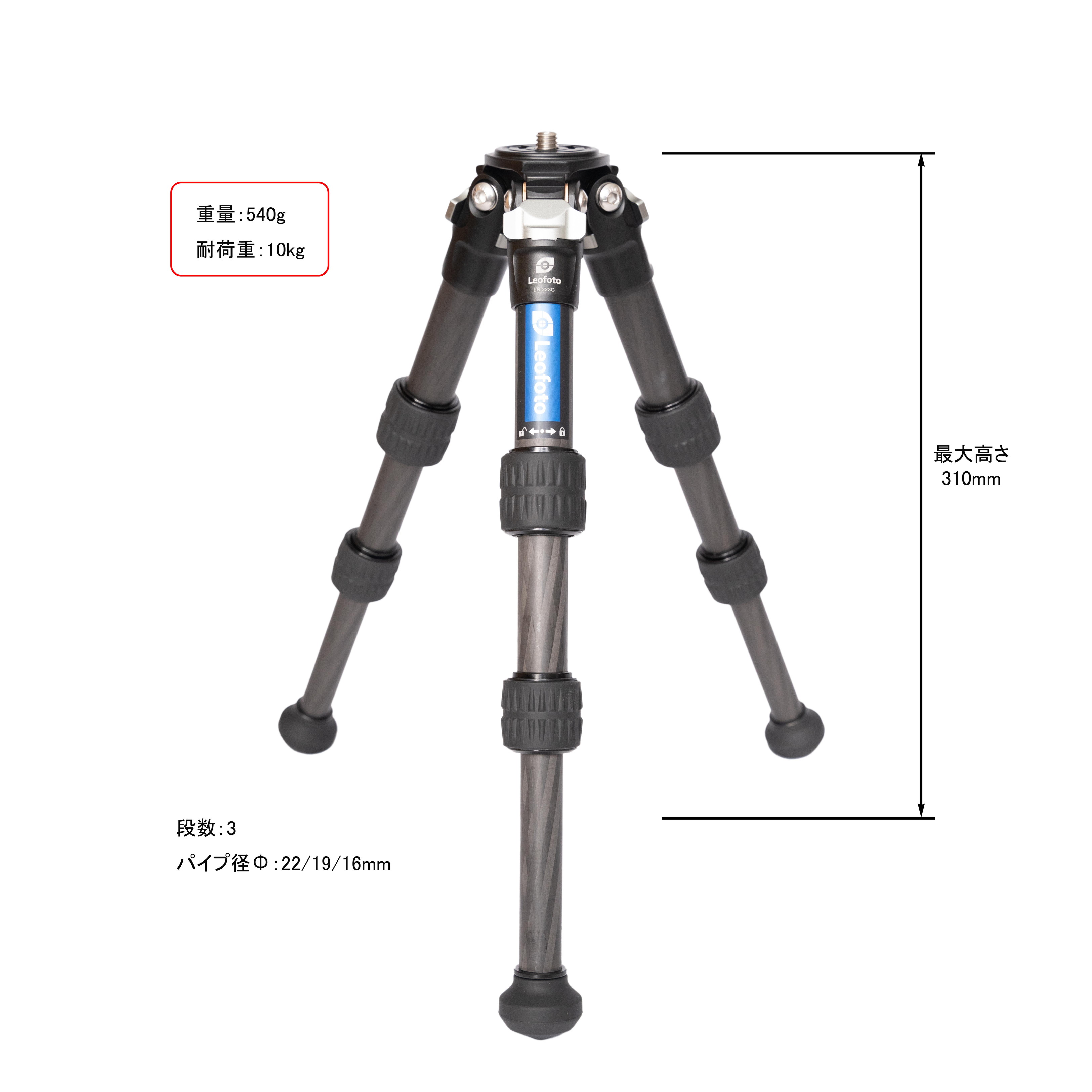 【仕様】 商品名:LS223C カーボン三脚(雲台・センターポールは付属しません。) 材質:10層カーボン 段数:3段 脚径:22/19/16(mm) 全伸長:310mm 最低高45mm 収納高:200mm 重量:0.53kg 耐荷重重量:10kg 雲台取付ネジ :UNC3/8(太ネジ)・UNC1/4(細ネジ) *可動式で両方のネジに対応できる構造になっています。 付属品:専用工具、収納ケース、スパイク石突