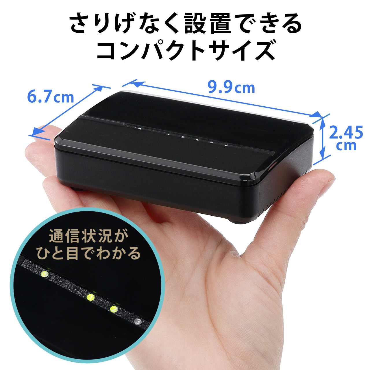 商品詳細10BASE-T/100BASE-TXに対応した、5ポートスイッチングハブ。手のひらサイズの、軽量、コンパクト仕様でお好みの場所に設置可能。ファンレス。静音。カスケード接続可能。仕様■本体サイズ:約W99×D67×H24.5mm■重量:約100g(本体のみ)■壁掛け用ホールサイズ:約W8×D20×H3mm■規格:IEEE 802.3(10BASE-T Ethernet)IEEE 802.3u(100BASE-TX Fast Ethernet)IEEE 802.3x(Flow control for Full-Duplex) ■アクセス方式:CSMA/CD■スイッチング方式:Store & Forward■伝送方式:10Mbps/100Mbps(全二重、半二重)■ポート構成:100BASE-TX/10BASE-T(RJ-45) AUTO-MDIX ×5ポート■バッファメモリ: 56Kbyte■MACアドレステーブル:1K■ACアダプタケーブル長:約145cm(コネクタ部含まず)■消費電力(MAX):1.24W■動作環境:使用時温度/0から40℃保管時温度/-20から70℃使用時湿度/10から90%保管時湿度/5から90%(結露なきこと)■生産地:中国■取扱説明書:あり■保証期間:ご購入日より6ヶ月表示された検索窓に商品番号を入力してください【 商品番号:500-SWH005 】【2017年1月登録】関連キーワード:サンワサプライ 4969887752753表示された検索窓に商品番号を入力してください【 商品番号:500-SWH005 】⇒こちらの商品のレビューを、もっと読みたい方はこちらスイッチングハブ ラインナップ500-SWH005購入はこちら500-SWH006購入はこちら500-SWH007購入はこちら500-SWH008購入はこちら500-SWH010購入はこちら