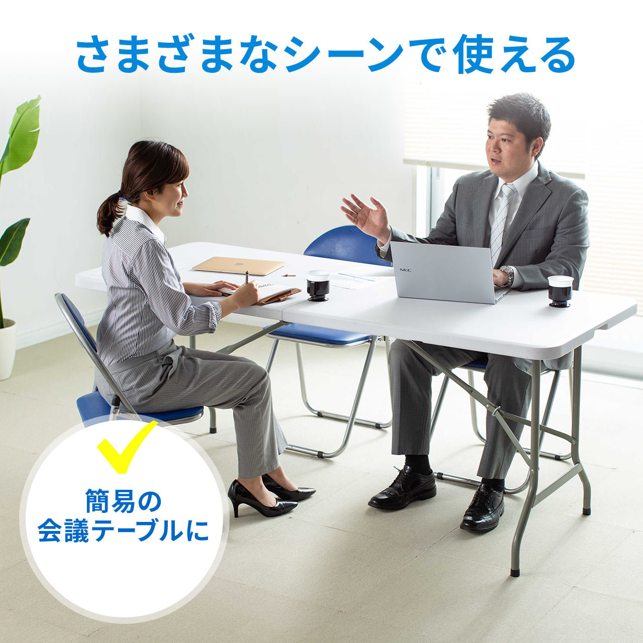 折りたたみテーブル 幅180cm 奥行74cm 樹脂天板 取っ手付き ホワイト [100-FD016W]