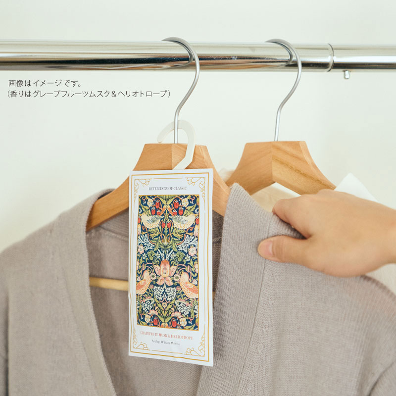 サイズ・容量〇size:W114×D4×H240mm〇volume(容量):15g素材・成分生産地タイ商品説明〇RETELLINGS OF CLASSIC リテリングスオブクラシック Art by William Morris 「モダンデザインの父」と呼ばれる「アーツ・アンド・クラフツ運動」の先駆者、ウィリアム・モリスの代表的なボタニカルデザインを用いたフレグランスシリーズ。【ウィリアム・モリス(William Morris、 1834 年 3 月 24 日 - 1896 年 10 月 3 日)】19 世紀イギリスのテキスタイルデザイナー、詩人、ファンタジー作家、アーティスト(作家)、印刷者、翻訳家、建築保護運動家、社会主義活動家。多方面に関わるアーツ・アンド・クラフツ運動主導者。彼の残した名言で、「役に立たないものや、美しいとは思わないものを、家に置いてはならない」があります。〇ウィリアム・モリスのデザインモチーフを用いたリテリングスオブクラシックは、細部までこだわったフレグランスアイテムと厳選された香りが創り出す世界観で、上質なライフスタイルへと誘います。〇フレグランスは不快な臭いの原因成分を化学反応、水素結合、ファンデルワールス結合により、違う成分へ変化させることを目的とした消臭機能を兼ね備えています〇Wardrobe Sachet ワードローブサシェワードローブの中に掛けることで、衣類もほのかに香るワードローブサシェ。ハンガーを畳み、写真立て等に飾ることで香る絵画として楽しむことが出来ます。〇STRAWBERRY THIEF不動の人気柄「イチゴドロボウ」。モリスが夏の別荘“ケルムスコット・マナー”の家庭菜園でイチゴを育てていたところ、食いしん坊の鳥たちにそれを盗られてしまった様子を描いた柄です。〇Fragrance-フレグランスの種類-Peony Peach & Musk ピオニーピーチ&ムスク程よい甘さのフローラルなピオニーの香りと深みのある優しいムスクが合わさった香り。 注意事項〇取引上の注意 ・掲載商品の仕様・デザイン等は予告なく変更する場合があります。・オークションでの販売はお断りしております。・掲載されている商品の色は、お使いのPCの環境によって実物と若干異なる場合があります。 〇使用上の注意・本品は食べ物ではありません。・お子様の手の届かない所でご使用下さい。・家具、衣類、プラスティック製品等にふれるとシミや変色を起こす場合がありますのでご注意下さい。・用途以外の目的ではご使用にならないで下さい。〇保管上の注意・高温多湿・直射日光を避け、乳児・ペットの手の届かない所に保管してご使用ください。製造販売元:有限会社三和トレーディング東京都中央区東日本橋2-3-1広告文責株式会社三和セレクト〒136-0071東京都江東区亀戸5-45-6 K・プラネット 603TEL:03-6802-9640メーカー有限会社三和トレーディング 区分 雑貨