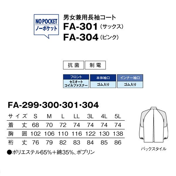 食品用白衣/工場用白衣 SerVoサーヴォ コート FA-304 男女兼用長袖コート ピンク S〜4LSALEセール