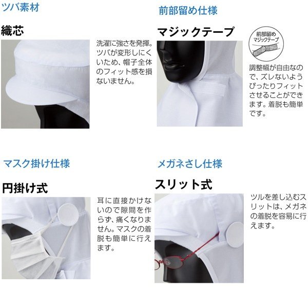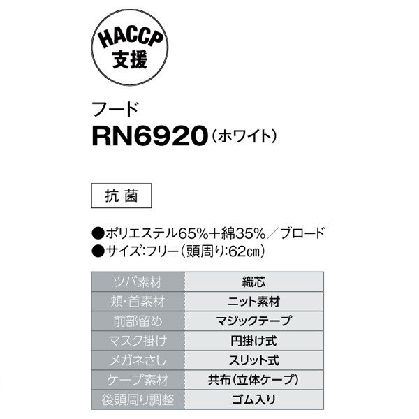 食品用ユニフォーム:帽子/フルフード サンペックスイスト/SUNPEXIST RN-6920 サンペックスイスト 食品用/工場用 帽子/フルフード RN-6920 フード ホワイト F ポリエステル65%+綿35%、ブロード サイズ:フリー(頭周り:62cm) ツバ素材:織芯|頬・首素材:ニット素材|前部留め:マジックテープ|マスク掛け:円掛け式|メガネさし:スリット式|ケープ素材:共布(立体ケープ)|後頭周り:ゴム入り フードタイプ HACCP支援 機能:抗菌