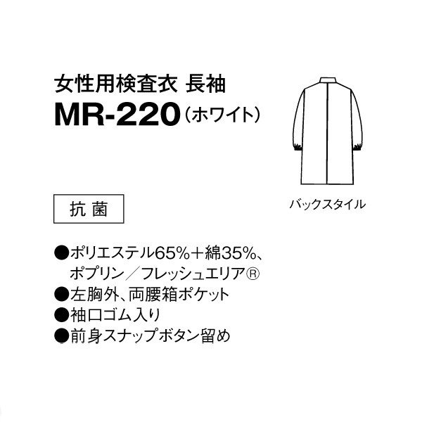 食品用ユニフォーム:検査・実験:検査衣 サンペックスイスト/SUNPEXIST MR-220 食品用白衣/工場用白衣 サンペックスイスト 検査衣 MR-220 女性用検査衣 長袖 ホワイト S〜4L ポリエステル65%+綿35%、ポプリン/フレッシュエリア 左胸外、両腰箱ポケット 袖口ゴム入り 前身スナップボタン留め 機能:抗菌 検査衣 検査・実験 安全性を高める高い抗菌・耐久性と様々な用途に応える豊富なデザイン 検査員/栄養士/研究員/薬剤師の方向き 生地混率:ポリエステル65%+綿35% 機能:抗菌|eco