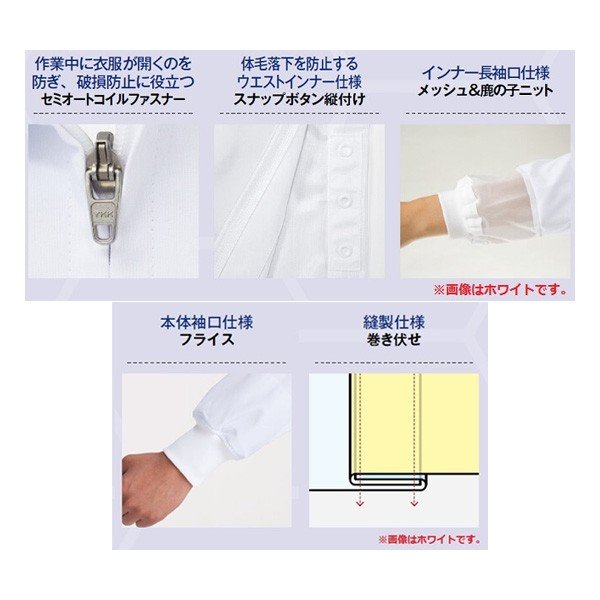 暑さと工業洗濯に対応するコスパの高い高機能素材 SUNPEX IST VP-621 お求めやす衣 男女兼用 VP 長袖ジャンパー【ホワイト】 高い機能性と手頃な価格帯を両立し、2016年の登場以来人気を誇るVPシリーズ。 素材やディテールにこだわったコスパの高いユニフォーム お求めやす衣 高い機能性を備えながらリーズナブルな価格帯の「お求めやす衣」。 快適さと体毛落下防止を考慮したディテールはもちろん、洗濯耐久性やカラーバリエーションも備え、好評をいただいています。 高温作業場向け、HACCP支援対応、交差汚染対策、NOポケット 男女兼用 フロント / セミオートコイルファスナー、縫製仕様 / 巻き伏せ、本体袖口 / フライス、ウエストインナー / スナップボタン縦付、インナー袖口 / 鹿の子ニット VP [暑さ対策、抗菌、制電、吸汗、速乾] 素材:ポリエステル 99%・複合繊維(ポリエステル) 1%、二重織ピケ [ウエストインナー] ポリエステル 100%、メッシュ