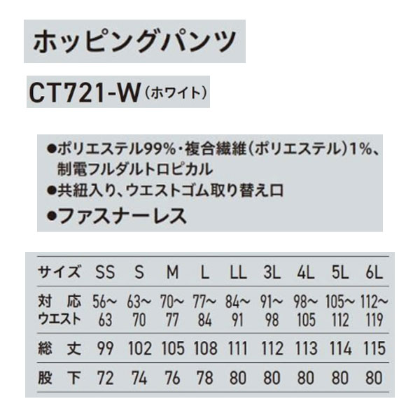 CT721-W・ホッピングパンツ 制電・防汚機能付きで ストレッチが効いた快適素材 制電フルダルトロピカル ポリエステル99%・複合繊維(ポリエステル)1% ■寒さ対策 ■制電 ■吸汗 ■速乾 ■防汚 ■ストレッチ
