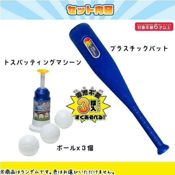 プラスチック製のバットとボールのバッティングセットが登場! トスバッティングマシーン付きなので1人でも遊べます♪ プレゼントはもちろん、子ども会や縁日、お祭りなどのイベント用にも最適! 【セット内容】 ・トスバッティングマシーン×1 ・バット×1 ・ボール×3 ※セット内容にないものは商品には含まれません。 ※色のパターンは2種類です。ランダムでお届けするのでお選びいただけません。 ◆パッケージサイズ:約H66.2×W23×D7.5cm ◆対象年齢:6歳以上 ◆製品材質:PS、PE ◆メーカー:オンダ ※画像と実際の商品は多少異なる場合があります。 ※ご利用の画面の設定・環境により色が違うように見える場合があります。予めご了承ください。 ※ご注文の前に必ずお読み下さい※ こちらの商品は、初期不良を含むすべてのサポートがメーカーサポートとなります。予めご承知の上、ご購入ください。 不具合等ございましたら、直接メーカーへお問い合わせください。