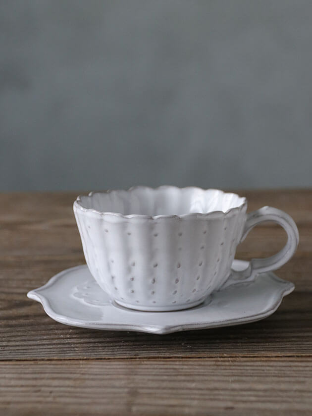 サイズ:カップ:直径10 x 高さ6 幅(持ち手含む)13cmソーサー:幅16 x 奥行16 x 高さ1cm重さ:200g(カップ)、220g(ソーサー) 満水容量:170ml 色:ホワイト 材質:陶器 製造:イタリアVIRGINIA ITALICA TEA CUP & SAUCER イタリア陶器メーカーVIRGINIA CASA社より素敵な白い食器のご紹介です。一つ一つイタリアの職人が手作りしたグレーがかった白の食器は、全体にシックでとても素敵です。繊細な花びらのようなカップにエレガントなソーサーの組み合わせが秀逸な逸品。おすすめです。 ブランドの詳細はこちらから → 一つずつ手作りの為、形や模様の出方、色合い等に個体差がございます。また、黒点、へこみ等がある場合がございますが、そういった風合いが特徴の商品になっております。 裏面が平らではなく多少カタカタする場合がございます。あらかじめご了承いただけます様、お願いいたします。 《ご購入の前に必ずお読みください》 陶磁器の特性として貫入という現象がみられることがございます。 貫入とは、釉薬が塗られている表面と素地の収縮率(縮み方)の違いで自然に生じる微細なヒビのことを指します。 陶磁器の貫入のヒビの入り方には、個体差があり、稀にヒビが目立ちやすいものがございます。 貫入が入った状態でも、基本的に食器として問題なくお使いいただけます。 しかしながら、水洗いの際に、貫入のヒビが目立つことがございます。 (水の入り込みは乾くと目立ちにくくなります) また、稀に、貫入が入った状態で、色の濃いお料理を乗せるとヒビの部分にお料理の油などが入り込み着色が目立つ恐れがございます。 カップとソーサーが少し違ったデザインになっているユニークなデザイン。カップの側面には小さなドットが沢山配されています。 裏にはブランドのロゴがプリントされています。 一つずつ手作りの為、形や模様の出方、色合い等に個体差がございます。また、黒点、へこみ等がある場合がございますが、そういった風合いが特徴の商品になっております。 ↓ サラグレースの特別なギフト包装はこちらから ↓