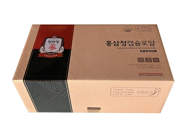 パッケージが変更になりました。 空港の免税店や、韓国有名デパートの免税店のみで販売されている正官庄の紅参精カプセルロイヤルです。 ■ 製造元:正官庄(韓国人参公社)/韓国 ■ 性状:カプセル ■ 容量:50g(100カプセル)x3箱(300カプセル) ■ 原材料名と含有量 -紅参濃縮液粉末(6年根、固形粉64%、ジンセノサイド Rg1+Rb1+Rg3 7mg/g、韓国産)22.4% 原料参配合比率:紅参根(胴体) 100% -葡萄種油、小麦胚芽油、蜜蠟、レシチン、霊芝濃縮液、鹿の角抽出液、凍結乾燥ローヤルゼリーなど ※韓国内用販売品と免税店用販売品(ROYAL)の主な違いは、使用している紅参の配合比率です。その他は韓国内用販売品とほぼ同じです。 ↓ ↓ ↓ ・韓国内販売商品:紅参根(胴体) 75%, 紅尾参(根) 25% ・免税店販売商品:紅参根(胴体) 100% その他機能情報や摂取方法などの詳細は韓国内用販売品の「【正官庄】紅参精カプセル180g」をご参照下さい。 ★「【正官庄】紅参精カプセル180g」はこちら!高麗人参(朝鮮人参)は昔から韓国で幅広い年齢層から愛飲されている特産品で、その品質の高さで世界的にも高い人気を誇ります。 紅参(韓国語読みで“ホンサム”と読む)とは、厳選した6年根の高麗人参を皮をむかず水蒸気で蒸して乾燥させたものを言います。 赤褐色をしているので、紅参と呼ばれます。 高麗人参 紅参精カプセルゴールドは、紅参の根の中でも高級根といわれる6年根紅参の真液が含まれている高純度の紅参濃縮液をカプセルに閉じ込め、携帯に便利で摂取しやすくした健康機能食品です。 6年根紅参とは、生育に適した韓国の風土のもと、高麗人参を6年もの歳月をかけて栽培し成熟させた最高の紅参のことをいいます。