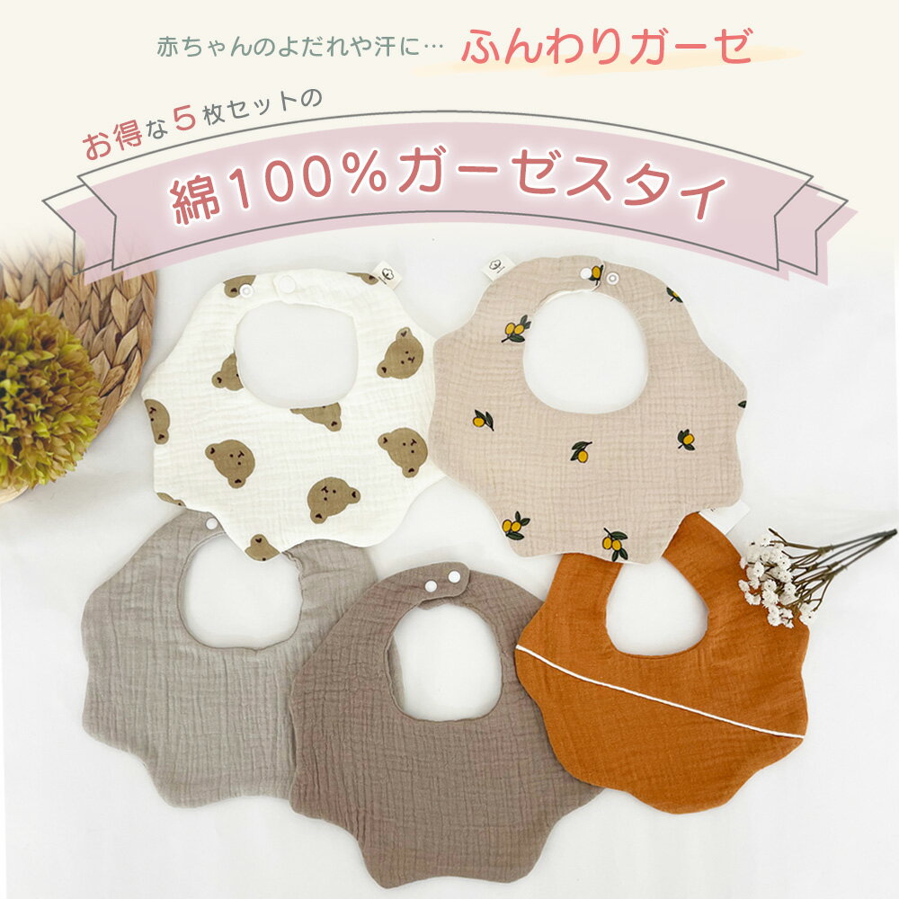 ガーゼ スタイ 5枚 セット よだれカバー よだれかけ 無地 シンプル 女の子 男の子 かわいい おしゃれ スナップボタン ビブ ベビー 出産祝い 通気性 吸収性 柔らかい 保育園 綿100% 5枚セット インスタ 映え