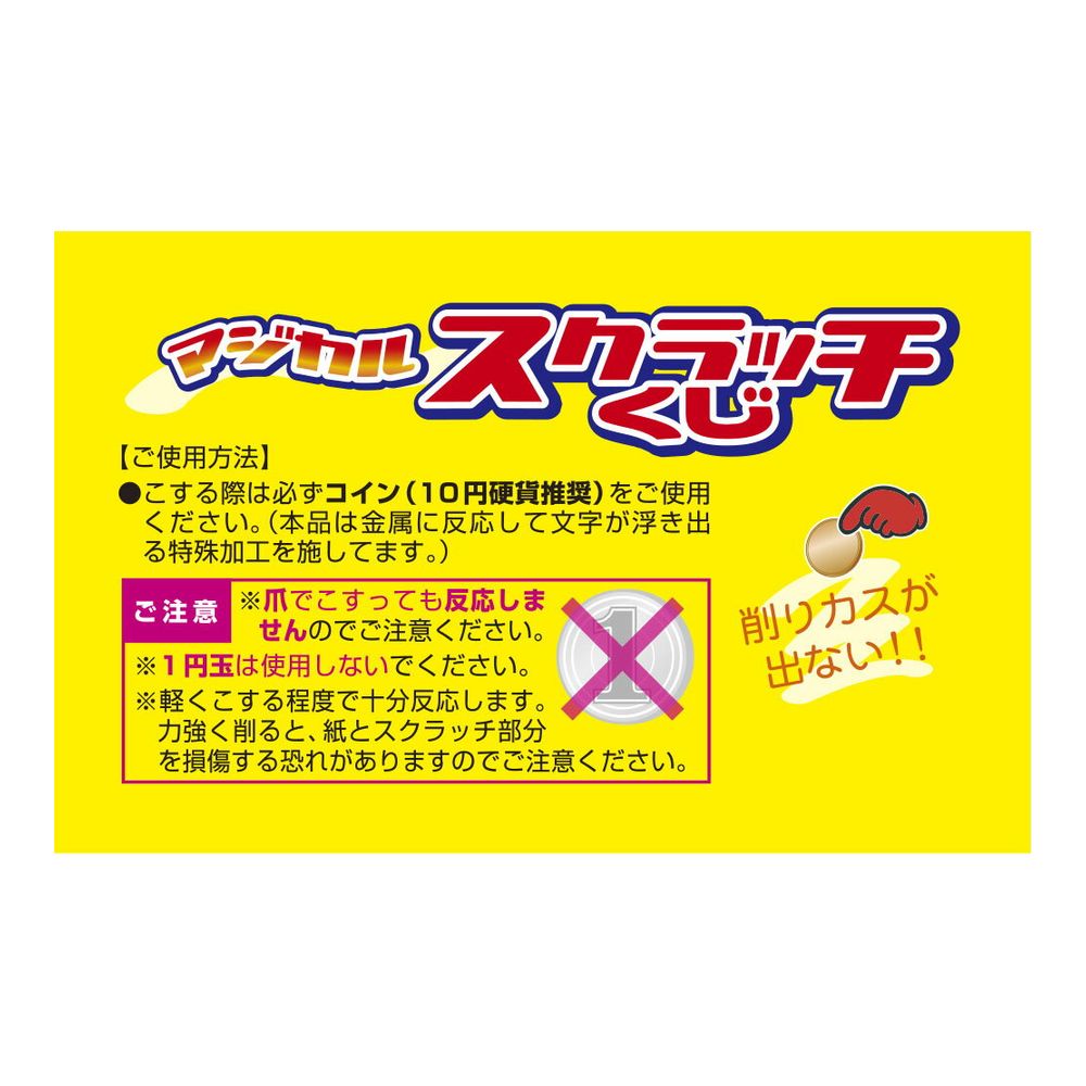 新感覚!削りカスの出ないスクラッチくじです。削りカスが出ないので飲食店でも衛生上の心配なく、イベント・抽選会・キャンペーン等にお使いいただけます。中央のバクハツ部分を削ると等級がでてきます。1パック全て同じ等級です。●陳列に便利なヘッダ付袋入り入り数:25枚袋入サイズ:縦55mm×横85mm材質:マットコート紙(157g/平方m)本品は金属に反応して文字が浮き出る特殊加工を施してますので、こする際は必ずコイン(10円硬貨推奨)をご使用ください。(本品は金属に反応して文字が浮き出る特殊加工を施してます。)※爪でこすっても反応しませんのでご注意ください。※1円玉は使用しないでください。 ※軽くこする程度で十分反応します。力強く削ると、紙とスクラッチ部分を損傷する恐れがありますのでご注意ください。※本品を袋から取り出した後の責任は負いかねますので、開封後の取扱いには充分ご注意ください(開封後のご返却はご遠慮ください)