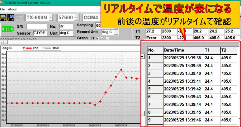 防水・お知らせアラーム機能つき2ch温度ロガーTX-600N本体、素線センサ(TP-300)2本、USBケーブル、専用ソフトウェア、ACアダプター、テスト電池、キャリングケースのオールインワンセット。 ■2チャンネルで温度を計測・記録ができるデータロガー温度計 ■工場内温度・中心温度管理に最適 ■食品の芯温からフライヤーの油温まで、幅広い範囲の温度測定が可能 ■視認性の高い大型モニタ ■防塵防水タイプIP66(プローブ接続部を除く) ■応答速度の早さはピカイチ ■USB接続でパソコンとの通信が可能 ■専用ソフトの優位性:リアルタイムに測定温度表の数値が更新され、前後の温度をリアルタイムに確認可能 ■9種類の熱電対に対応可能 K熱電対、J熱電対、E熱電対、T熱電対、B熱電対、R熱電対、N熱電対、S熱電対、C熱電対 ■2チャンネルのセンサープローブ入力端子 ■上限アラーム温度と下限アラーム温度の設定が可能 ■T1-T2温度差表示 ■データホールド機能 ■最大値/最小値/平均値表示機能 ■9V形乾電池、または専用ACアダプター(付属)で動作 2ch防水温度計セットTX-6000A (TX-600Nとアクセサリのセット)の仕様 注意:温度センサーによって温度測定範囲は異なります。 対応センサー K、J、E、T、B、R、N、S、C型熱電対 測定範囲 K -200.0~1370.0℃ J -200.0~1200.0℃ E -210.0~1000.0℃ T -220.0~400.0℃ B 320.0~1800.0℃ R -20.0~1700.0℃ N -200.0~1300.0℃ S -20.0~1750.0℃ C 0.0~2300.0℃ 精度 ± 読取値の0.1%+0.1℃ (18~28℃において) ± 読取値の0.1%+0.2℃(上記以外) 冷接点補償機能あり 分解能 K、J、E、T、N、C型 0.1℃ B、R、S型 0.5℃ 記録間隔 約0.4秒 データロガー記録間隔 2秒~120分(ユーザー設定可能) メモリ 16,000件×2チャンネル 主な機能 Hi/Loアラーム機能 T1-T2温度差表示 データホールド機能 最大値/最小値/平均値表示機能 USB/RS232インターフェイス データロガー 9V形乾電池、または専用ACアダプターで動作 バッテリー定電圧警告表示 自動/手動電源オフ機能 校正機能 バックライト 防水防塵規格IP66対応 出力 専用ソフトウェアとUSB・RS232ケーブルによる出力 電源 9V形乾電池(006P)×1 または専用ACアダプター(別売) ※ACアダプター使用時は非防水 寸法/重量 150×75×28 mm、約320g(電池を含む) 入力端子 標準ミニ熱電対ソケット×2 使用環境 温度:-10~60℃、 湿度:0~90%RH(結露なきこと) 付属品 TX-600N本体、佐藤商事オリジナル日本語取扱説明書 素線センサー(TP-300)×2、テスト電池、キャリングケース、ACアダプター(AP-209CP10)、USBケーブル+ソフトウェア 上記の精度および記録間隔は、温度センサーによる誤差を含みません。