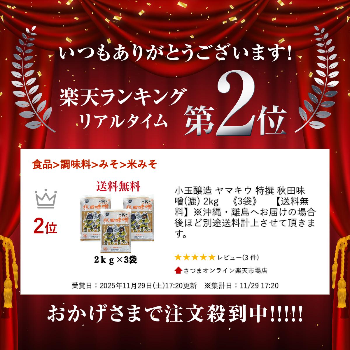 小玉醸造 ヤマキウ 特撰 秋田味噌(漉) 2kg 《3袋》 【送料無料】※沖縄・離島へお届けの場合後ほど別途送料計上させて頂きます。 小玉醸造 ヤマキウ 特撰 秋田味噌(漉) 2kg 米みそ原材料名大豆(ロシア又は中国又は国産)、米、食塩、酒精内容量2キログラム保存方法直射日光を避け、常温で保存してください。開封後は風味を保つ為できるだけ冷蔵庫に入れて下さい。製造者小玉醸造株式会社賞味期限 3か月以上おすすめポイントヤマキウ 特撰秋田味噌 は、赤系辛口みその代表銘柄の一つとされており、一般的な辛口みそに比べて、大豆に対する米麹の使用割合が非常に高いのが特徴であり、甘口の製品です。色調も濃赤褐色と言うよりは、明るい赤系であり、特に新しい技術で撰択培養した、当社独自の耐塩性酵母と乳酸菌を加えて?酵熟成させた製品です。おだやかな香りと、塩なれしたやわらかな甘みと旨みの調和した製品ですので、味噌汁はもちろんのこと、各種の味噌料理等にも是非ご愛用ください。当店では入荷後すぐに冷蔵保管致しておりますが発送は常温便を利用致しております。夏場の外気が高温の場合お客様からご要望があれば追加送料350円加算させていただき冷蔵発送可能ですのでご利用ください。 5