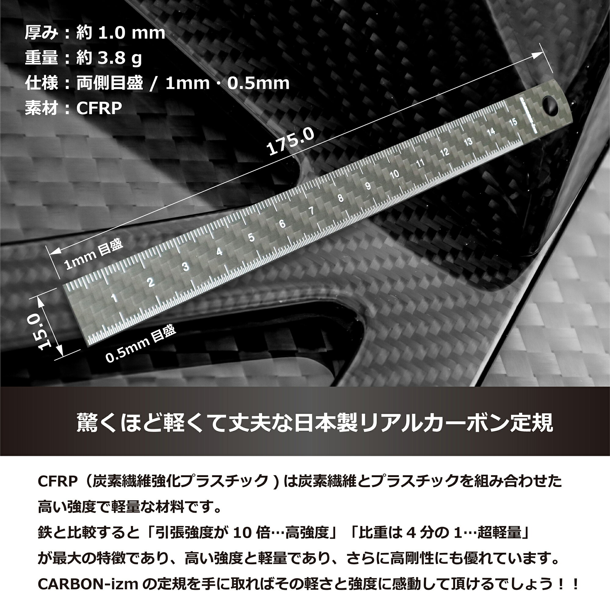 ・CARBON-izmのドライカーボン製15cm定規。ドライカーボンプレートから、一本一本削り出して作る本製品は日本製(国産)で高級感あふれる逸品です。 ・超軽量3.8gのリアルカーボンだから薄くて丈夫で、その軽さと強度が特徴です。目盛りは工業シルク印刷(白色)で摩耗性にも優れ、視認性にも優れます。1mmと0.5mmの両目盛りで使い勝手抜群です。 ・表面はツヤ無し(マット)で落ち着いた印象を与え、使用環境を選びません。また、熱膨張率にも優れ目盛りの正確性に関しても定評があります。 ・本製品は綾織を採用しています。織り目が浮き上がる美しさこそカーボンの魅力であり、その織り目・模様の美しさは工芸品や芸術品にも引けを取りません。 ・カーボン(CFRP)は、スチールと比較し重量は約1/4と超!軽量にも関わらず、強度は約10倍…まさに先端素材の一つです。その特性からレーシングカーや戦闘機など、特殊な用途に採用されてきましたが、今やインテリアやファッション業界などでも取り入れられつつ人気素材です。そんな先端素材をステーショナリーに落とし込んだスタイリッシュな定規です。 ■ 本体重量:約3.8g ■ 本体素材:CFRP(炭素繊維強化プラスチック) ■ 織り目 : 綾織・艶なし ■ 色:ブラック ■ サイズ:175 × 15 × 1.0 (mm) ■ブランド : CARBON-izm / カーボンイズム カーボン製定規は15cmの厚み2種類と30cmの1種類が設定あります。 30cm定規はこちらからご確認できます。
