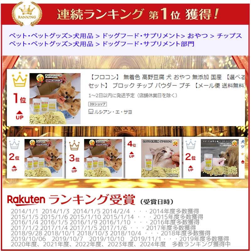 ★こちらは3袋セットのページです★ フロコンのブロック・チップ・パウダーを選んで下さい♪ 【メール便 送料無料】【宅急便不可】 日時指定が出来ませんご了承下さい。 3種類選べる単品はこちら 定期購入3回分はこちら 定期購入6回分はこちら 定期購入12回分はこちら フロコンの他の種類一覧はこちら 食べ合わせが良い組み合わせのサポート食 鮫フォルテはこちら 対応犬種:「チワワ/トイプードル/ミニチュアダックス/カニンヘンダックス/シーズー/パピヨン/ヨーキー(ヨークシャテリア)/ポメラニアン/マルチーズ/ミニチュアピンシャー/イタグレ/ウェストハイランドホワイトテリア/キャバリア/ケアーンテリア/ノーフォークテリア/パグ/ペキニーズ/柴犬/コギー/ジャックラッセルテリア/ビションフリーゼ/アメリカンコッカースパニエル/ミニチュアシュナウザー/アメリカン・コッカー・スパニエル/イングリッシュ・コッカー・スパニエル/ウィペット/ウェルシュ・コーギー/シェットランド・シープドッグ/シバイヌ(柴犬)/スピッツ/ビーグル/フレンチ・ブルドッグ/ボストンテリア/フォックステリア/甲斐犬/アフガン・ハウンド/エアデール・テリア/シープドッグ/ハスキー/レトリバー/ダルメシアン/シェパード/セント・バーナード/ドーベルマン/バーニーズ/コリー/ボルゾイ/秋田犬」 対応猫種:「マンチカン/スコティッシュフォールド/アビシニアン/アメリカンショートヘア/ ラグドール/メインクーン/ロシアンブルー/エキゾチックショートヘア/ベンガル/ソマリ」 小型犬用、中型犬 のパピー(仔犬)用 リピーター率NO1 SAYOロングセラー 楽天おやつチップスランキング スーパーフード 【1位獲得 高野豆腐フロコン】 [おからパウダー必見!] SAYOブランドオリジナル 高野豆腐フロコン 無添加・無着色・国産・低カロリーレジスタント プロテイン オーナーSAYOの先代愛犬Mダックス「ラム」が病弱な上、合う食べ物がなかなか見つからず、 自らオリジナルサポートフードとして高野豆腐「フロコン」を開発致しました。 短命だと病院では言われておりましたが、 毎日のフードにふりかけとして愛用し、 16歳まで犬生をまっとうする事が出来ました。 同じようにアレルギーや食生活にお困りの方へ少しでもお役に立ちたいという想いで販売を致しております。 現在もSAYOブランド看板犬3代目Tプードル「ルビー」、4代目「レモン」も愛用中です。 人の食品工場で作成しており、人も食べれる高野豆腐です。 人・子ども・愛犬に愛される高野豆腐です。 人間用としては、お味噌汁、溶き卵と溶いたりなど出来ます。 愛犬・愛猫用には主食にふりかけてご利用のお客様が多くいます。 ふりかけには、ブロック・パウダーがオススメです。 小型犬ですと毎食2.5gをふりかけるとちょうど1袋が10日分となります。 3袋で1か月分とお考え頂くと良いかもしれません。 通常のサポートで使用する場合は1日5gを主食・おやつとしてお与えください。 ダイエットとしてのご利用の場合は、1回の固形フードを2g減らし、フロコンを2g足してお試しください パピー(仔犬)の場合は離乳食が始まったらすぐ与える事ができます。 体の土台作りに持ってこいです。 シニアのわんちゃんには尿漏れ防止を気にされるオーナー様が イソフラボンを意識されていらっしゃいます。 また、主食に混ぜるだけではなく、 トイレトレーニング、しつけ用フードとして ご褒美に与えやすいブロック・チップが人気です。 ブロックは1袋に50g=500粒くらい入っており、 お友達とシェアしたり、少しづつ与える事が出来ます。 また、チップは中型犬・大型犬に人気があります。 与え方目安 ★与え方(1日目安)★(グラム/ ブロック/チップ/計量スプーン) ●超小型犬・小型犬(〜9kg) =3〜5g位 /25〜50粒位/10〜20枚位/小さじすり切り 2〜3杯位 ●中型犬 (9〜22.5kg) = 5〜8g位/45〜80粒/15〜30枚位/大さじすり切り 1杯位 ●大型犬 (22.5kg以上) = 8〜15g位/75〜150粒/25〜50枚位/大さじすり切り 2杯位 ※1袋 約10日分 仔犬・高齢犬にも使える! ウォーターフロコン ** フロコンの6倍のぬるま湯に浸して主食に混ぜて下さい。 ナチュラルフロコン* *そのまま主食にふりかけ混ぜて下さい。 原材料 原材料:丸大豆(遺伝子組換えでない)、豆腐用凝固剤(にがり)、重曹 カロリー:262kcal/1袋あたり 成分表示 ・蛋白質25.9g ・脂肪17.2g ・炭水化物1.8g ・ナトリウム 210mg ・カルシウム 241mg ・鉄3.5mg 内容量:プチ・ブロック・チップ 50g、パウダー60g おおよそのサイズ(縦横厚み):プチ(5x6x4)・ブロック(5x15x4)・チップ’(10x15x4)mm 賞味期限:パッケージ記載 ご注意事項 【送料について】 3袋のご注文でメール便無料となります。 【与える時のご注意】 ・開封後はお早めにお召し上がり下さい。 ・直射日光を避け、なるべく乾燥した涼しい場所で保存して下さい。 ・フロコンは水分を吸収しますので、十分な水分を与えてください。 ・万が一、調子が悪くなった時には、給餌を止め獣医師と御相談下さい。 SAYOオリジナルフード類はこちら Copyrigt