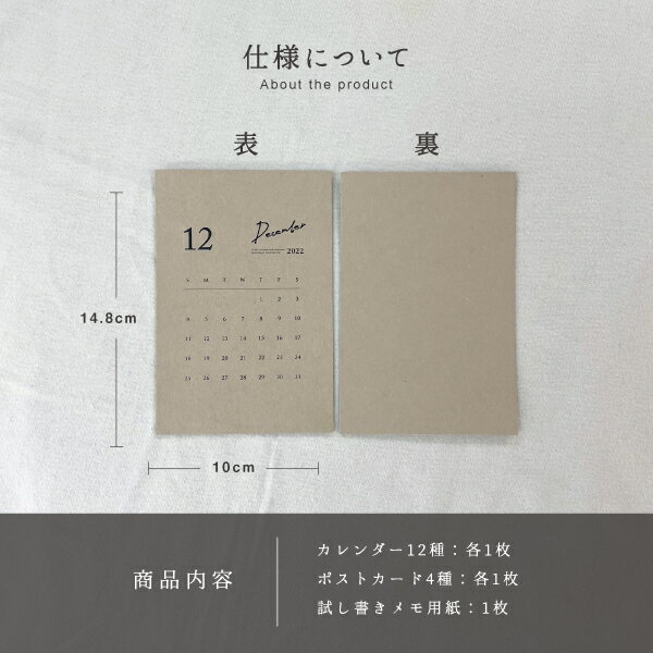 カレンダーポストカード 商品説明 人気のポストカードにカレンダータイプが登場。 カレンダー12か月分と、インテリア用の韓国ポストカード(ミニポスター)4枚が入った16枚セット商品です。 カレンダーポストカードはカードスタンドやフォトフレーム、クリップなどで飾ったり、 インテリア用の韓国ポストカード(ミニポスター)は壁に貼ったり、物撮りの小物として置いたり、 場所を選ばずにどこにでも飾ることができます。 ナチュラルインテリアと相性が良い色合いでお部屋に飾るとぐっとお洒落になります。 あらかじめ下記内容をご了承のうえ、ご購入ください。 こちらはポストカードのみの商品です。商品画像にて使用しております小物等は付属いたしません。 用紙の特性上、紙の繊維が所々に見えておりますが、汚れではございません。 お客様のご覧になられますパソコン機器およびモニター設定、 また撮影時の照明により実物の色と相違する場合もあります。 イメージ違い、色むら、色落ち等による返品はお受けできません。 お客様都合での返品は原則として受け付けておりません。 サイズ 100mm×148mm(はがきサイズ) 内容 カレンダー12種:各1枚 ミニポスター4種:各1枚 試し書きメモ用紙:1枚 用紙 ブンペル 175kg 納期 12時までのご注文と決済完了で、土日祝日を除く2~3営業日以内に発送いたします。 受注生産品のため、途中キャンセルや、お客様都合での返品・交換等、お受けすることができませんので、あらかじめご了承ください。 梱包・配送方法 防水のためOPP袋へ入れ、ポスト投函にて発送します。 2025/4/15注文分より印刷機が変わりました。 高精細かつ高品質な色味再現は、これまでの従来機と変わらず、美しい仕上がりに。。 若干色味の表現が変わるため、以前ご注文いただいたものと色味の違いが出る可能性がございます。。 印刷品質上は特に問題の無い仕上がりとなりますので、以前との色味の違いによる返品・交換は対象外とさせていただきます。 このようなキーワードでも検索されています 2026 2026年 カレンダー ポストカード セット アート ミニポスター ミニカレンダー 卓上カレンダー はがき おしゃれ かわいい ナチュラル プレゼント ギフト インテリア 韓国 北欧 雑貨 ナチュラルインテリア 韓国インテリア 北欧インテリア カードスタンド クリップ ポスターカード おうち時間 ウォールデコ ひとり暮らし 一人暮らし リビング 寝室 玄関 写真立て フォトフレーム 韓国っぽ ルームツアー クロッフル メイクマイルーム インマイルーム ルムツア ナチュラルカントリー 淡色 女 男