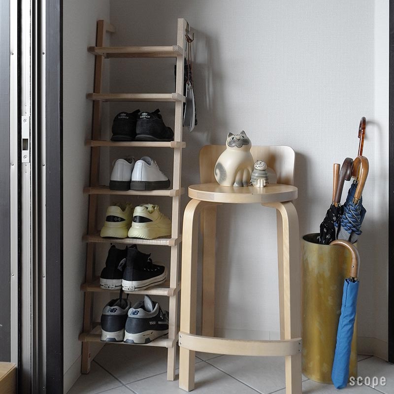 組み立てるシューラック コツは、仮止め→本締め 明るく軽やかな見た目どおり、とても軽くて女性ひとりでも組立てや設置が楽にできる、アッシュ無垢材で作られたシューラック。実はお恥ずかしながら「完成品」で届くと勘違いしていた私、組立てと知って急に腰が重くなり、数日間寝かせておりました。がしかし開封してみれば難しい事はありませんでした。2枚のタテ板と7枚のヨコ板それぞれに、直接アルファベット印が押されていますから、AとAを同じ向きでくっ付き合わせるようにして、付属の六角レンチでネジ止めしていくだけ。説明書を読まずともなんとなく理解できますが、ヨコ板を「∀」のように逆さまに組み合わせるのは間違いですのでご注意ください。上手く完成させるためのコツが1つ、一旦全てのパーツを軽く仮止めした状態で完成させ、最後にガッチリ本締めすること。一段づつ順番に締め上げてしまうと、後半にヨコ板が入らなくなってしまいます。そんな時は全体のネジを緩めて調整するとうまくいきます。「仮止め→本締め」を鉄則として組み立ててみてください。また、最初は明るくて綺麗なアッシュ素材、日に焼けて落ち着くまでは靴裏の汚れが気になる場合があります。日常のお手入れは水拭きで十分ですが、オイルフィニッシュを試してみたい方は、収納力の大きいシューラックGastonのページでご紹介していますので参考にしてみてください。 靴のスタメンは 仕舞わずに収納 学生の頃から引越しを繰り返し、今回でマンションタイプに住むのは7軒目。どんな物件にも大抵備え付けの下駄箱がついていたのに、なんで?なんでななの?こんなに玄関の床に靴が溢れかえってしまうのは。それは考えるまでもなく、脱いだ靴を下駄箱に仕舞う習慣がないからです。「面倒くさい」は、もちろんあります。でも根本的な理由は「脱いだばかりの靴を下駄箱に入れるのなんかイヤ」という気持ちにあったりするのです。狭くて密閉された下駄箱に家族全員が毎日脱ぎたての靴をギュンギュンに入れたら、、、さらに夏バージョンで、と考えると、一旦脱いだままにしとこか(仕舞うの面倒だし)。となるのです。それを良しとしていたので、子供は(私も)よく履くスタメンの靴を全足玄関に出したまま。結果、床面積の1/3くらい靴で埋まっちゃってる、1/3の玄関の現状。これでは玄関に明るい未来が見えない。そんな長かった暗黒時代に彗星の如く現れたというか、やっと私のピントが合ったのがレディロングという素敵な響きのシューラックです。スコープでも長く取り扱っているのになぜ今までスルーしてたのか。早速、設置してみた様子が上の写真です。固定された下駄箱の横にあるデッドスペースにジャストフィット。極端ですが、玄関サンダル以外のスタメンを全部入れてみたらスッキリ!オープンラックなのでこんな狭い空間でも通気性抜群、靴を仕舞うハードルが断然低くなり、我ら面倒臭がり親子でもなんとか維持が可能。靴が散らばっている玄関は運気が下がるとよく聞きますが、整った玄関は単純に気持ちが良いですね、もう運気が上がる気しかしない! 収納できる靴は、 6足+2足 幅30cm、奥行25cmに収まる縦長のレディロング、A4サイズくらいの空きスペースがあれば置くことができます。立てかけるだけのシンプルな家具なので壁に穴を空けなくてもOK、賃貸住まいには助かります。ラック自体に7足、一番下に直置きで1足、最大8足分収納することができるのですが、一番上と一番下は空けて6足までにしておいた方がスッキリして見えるかなという印象。横のスペースに余裕があれば傘が2本かけられます。東屋のHOOK No.2を組み合わせれば、折り畳み傘や靴べらも引っ掛けることができて機能的に使えます。 オマケの靴べらが かなりイイ オマケで付属してくるヘアライン仕上げのアルミに革紐を組み合わせた靴べら。極シンプルだから下駄箱の上にポンと置いておいても雰囲気が良く、無駄に主張してくる事もありません。必要な時にしか使わないのであれば、シューラックにS字フックで引っ掛けておくのもいいです。地味なアイテムながら、使ってみれば靴のつま先をトントンしなくてもスルッと履けるし、かかとを踏みつけながら履く事もないので、玄関先での所作がなんだかスマートになりました。何よりも靴べらを使ってかかとを入れると靴が傷みみくく長持ちします。小さくて軽量なので、シャチョウは外出先での靴の脱ぎ履き用としてバッグのポケットに入れて持ち歩いています。 靴じゃない収納(1) 一人暮らしの洗面所 新品をお迎えするタイミングで試してみたかった「靴じゃない収納」をやってみました。まずはスタッフ大原が一人暮らしの洗面所で実際に活用しているタオル収納。下からバスマット2枚、ミニバス2枚、フェイス6枚、ライト2枚を収納しています。バスについては、収まりよく畳むにはテクニックが必要な上、一段に一枚しか入りませんでした。ミニバスを