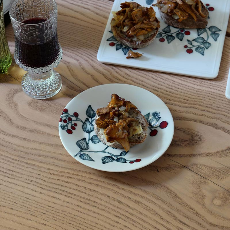 ヘイニ的ルノ日記オープンサンドの取り皿 2025年はスコープ25周年。だからこそ、新作には特別なアイテムを3種類も選びました。定番としては選びにくいけれど、手持ちに加えておきたい、そんなアイテムたちです。その一つが、コーヒーカップ&ソーサーのソーサー、つまりプレート14cm。少し小さなこのプレートを、Runoのデザイナー ヘイニ・リータフフタはどんなふうに使っているのか?実際にヘイニの自宅で見せてもらいました。やはりプレート14cmは、各々の取り皿として使うことが多いようです。ヘイニの旦那さんミッコが手際よく作ってくれるオープンサンド、生ハムとチーズ、スカーゲン(小エビ)のタルタル、カンタレリのソテー。次々とサービングプラターに並べられる料理を、プレート14cmに取り、みんな好きなように食べる。お酒はシャンパンから白ワイン、そして赤ワインへ。グラスはどんどん変わっていっても、プレート14cmはそのままです。気軽で楽しいお酒の時間に、フロストベリーが花を添えていました。それにしても、ミッコの料理の腕前はまるでシェフ。どれも本当においしくて、ついついお酒も進みました。 コーヒーカップのソーサー ヘイニ自ら焼いてくれたキャロットケーキを囲んでのデザートタイム、コーヒーカップとプレート14cmをC&Sとしてセットしてくれました。カップ単体でもカジュアルに使えますが、プレート14cmを組み合わせると見栄えがグッとよくなり、少しよそいきな雰囲気になります。そんなテーブルをよく見てみると、ケーキの取分け皿として使われているのはプレート16.5cm、ケーキリフターの置き場にはプレート11.5cm。サイズの異なるプレートが、それぞれの場所で自然に役割を分け合っていて、その見た目のバランスがとても素敵でした。数字だけ見れば16.5cmと14cmと11.5cmの違いはわずか2.5cm。いろいろ持たなくても良いように感じるかもしれません。でも、スモールプレートは複数を組み合わせて使うことが多くなるので、サイズがいろいろ揃っていた方が、テーブルでの見た目はずっと素敵になります。また、それぞれのサイズに合った用途があり、それは使いながら気付いていくので、まず1枚試しに使ってみるのもおススメです。 2025年の新作ルノはステッカー付き プレート14cm、コーヒーカップ、サービングプラター。この3アイテムを、2025年の新作として、スコープ25周年の記念アイテムにしました。もちろん、今年だけのスコープ25周年バックスタンプです。そして、せっかくの特別な年だから、新作3アイテムにはオマケを付けたくて、Runoフロストベリーのステッカーを作ってみました。各アイテムごとに異なるステッカーが1個に1枚付いてきます。パソコンやノートなど、身近なアイテムに貼って、自分のまわりをRunoフロストベリー化してみてください。 ※ステッカーの仕上がりが想定より少し明るめになりました。不要な方はご注文時に「ステッカー不要」とお知らせください。 サイズ違いで使うのナイス ルノフロストベリーの小皿が11.5cm、14cm、16.5cmと充実してきました。バリエーションが増え、サイズ違いのプレートを組み合わせて使えるようになったのは、凄く便利だと感じています。便利というだけでなく、同じサイズ・同じ柄を並べるより、サイズが違って柄の入り方も少しずつ違いはあるんだけど、同じシリーズという並びの方が、見た目にも強弱があって綺麗です。実際、僕のテーブルでも14cmと11.5cmを併用することが多くなりました。ケンタッキーのフライドチキンに14cmはちょうどいいサイズですし、グラタンの取り分け皿としても使います。小さなお皿は場所を取らないし、14cmは程よく大きさがあるので使えるシーンが多いようです。 スペック 材質 磁器 寸法 約φ140×H20mm リムを除いた内寸 φ75mm /約170g 生産 Made in Thailand 備考 オーブン(直火不可):○ / フリーザー:○ / 電子レンジ:○ / 食器洗浄機:○ 購入前に確認ください ・ 柄の色が小さく抜けている場合があります。 ・ 小さな黒点やピンホールは良品としています。
