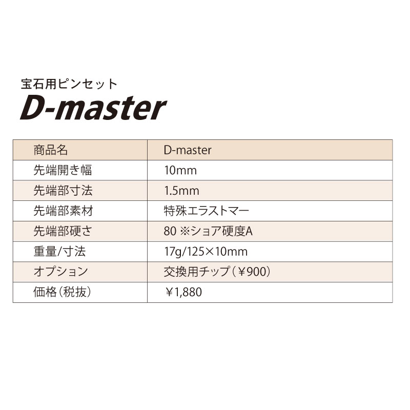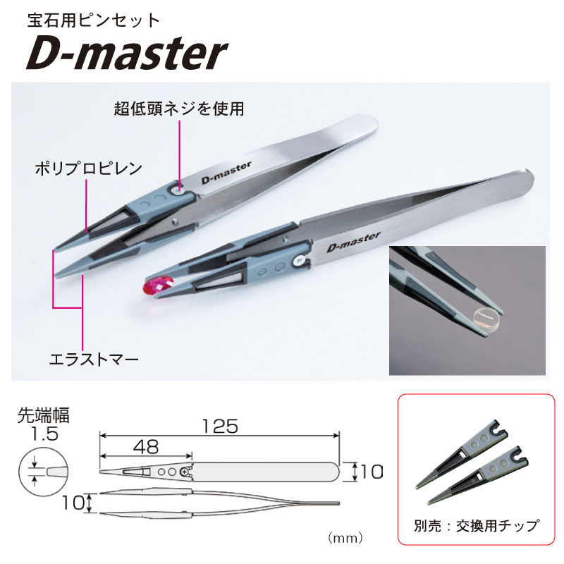 ■詳細:D-masterは、特殊樹脂を高精度に加工、ステンレス素材と組み合わせることで、とてもなめらかな宝石のピックアップ動作を実現、対象物にキズを付けず、ソフトにしっかりと掴むことができます。 小さなメレー、テーパーから約3カラットまでのダイヤモンドや色石などの様々な作業に最適、余分な力が要らないので疲れません。 また、静電気を帯びない帯電防止材を使用しているので、時計部品やIC、ガラス部品のピックアップ作業にも最適です。 ※先端は交換可能です。