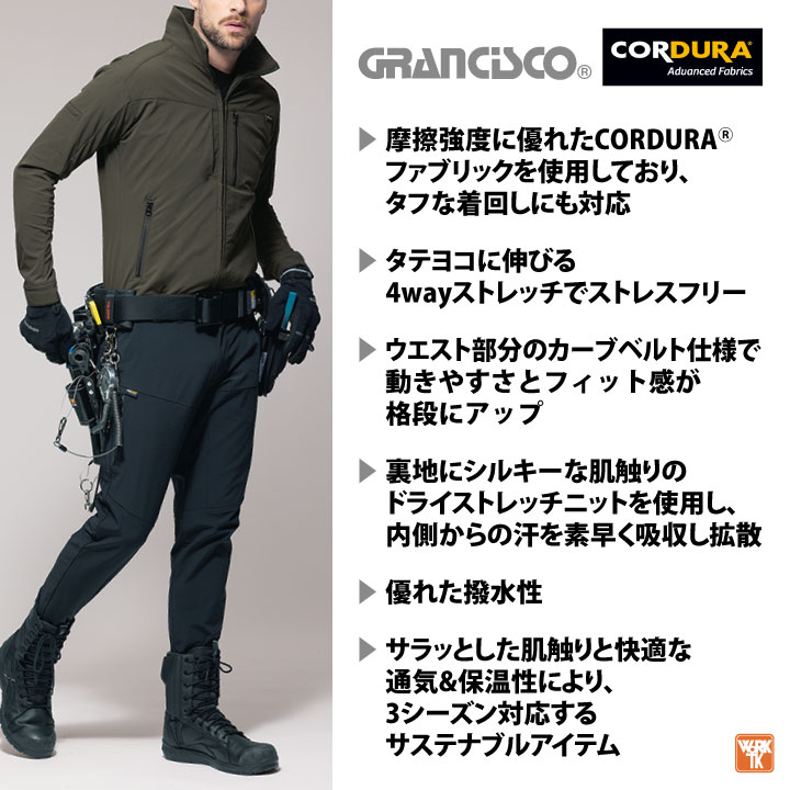 商品説明 GRANCISCO GC-W513 カーゴパンツ 商品の特長 圧倒的に優れた耐摩耗性を実現。 タテヨコに伸びる CORDURA(R) 4wayストレッチで ストレスフリー。 ●非常に優れた引裂き、引張り強度 ●タテヨコ自由自在、4wayストレッチ ●撥水性、軽量性 ●しっとりとしてしなやかな手触り 素材 表側:ナイロン88% ・ ポリウレタン12% 裏側:ポリエステル95% ・ ポリウレタン5% カラー ブラック ・ オリーブ ・ チャコール サイズ S ・ M ・ L ・ LL ・ 3L ・ 4L ・ 5L ・ 6L ・ 7L オプション加工 すそ直し(裾直し)、裾上げ はこちらです。 下にサイズがない場合はこちらのサイズをクリック モニターにより実際の色と多少ちがって見えることがあります。 人気商品のため、商品在庫が欠品することがあります。 ・モニター等の環境による色の誤差や、素材により色ブレが生じる場合があります。 ・表記サイズには若干の誤差が生じる場合があります。 ・ご注文のタイミングによって、商品が欠品している可能性があります。 ・運送会社の状況・災害時・繁忙期などにより配送が遅延する可能性があります。 ・土・日・祝は休業日となっております。発送までの日数には含まれませんのでご注意ください。GRANCISCO GC-W501 series
