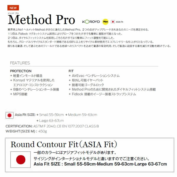 SMITH ヘルメット METHOD Pro Mips ASIA FIT / メソッドプロミップスアジアフィット 定価: ¥34,500 (税抜き) 業界売上No1 ヘルメットMethod がさらに進化したMethod Pro。 2つの点がアップグレードされあなたのニーズを満足させる。1つ目は、Fidlock マグネットシステム採用によりグローブをつけた片手でも簡単に着脱が可能となった。2つ目は、ダイヤルフィットシステムを採用しこちらも片手でより簡単にフィット調整を可能にした。もちろん、グローバルリサイクルスタンダード規格である68% 以上をリサイクル素材使用でエコフレンドリーな仕上がりとなっている。限りある資源、そして遊ぶためのフィールドである地球へのリスペクトを込めて資源の有効利用、そして製造に起因する害を減らす活動を続けている。 ■PROTECTION 軽量インモールド構造 Koroyd マテリアルを使用した エアロコア・コンストラクション 8個のベンチレーションホール装備 MIPS搭載 ■FIT AirEvac ベンチレーションシステム 取外し可能イヤーパット 脱着可能ゴーグルロック Method Proのために開発されたダイヤルフィットシステム搭載 Fidlock 搭載のイージー装着ストラップシステム Asia Fit SIZE: S/55-59 M/59-63 L/63-67 ◆予めご了承下さいませ◆ 在庫システムのデータ反映タイムラグ等により、まれにご注文商品が欠品している場合がございます。 お使いのパソコンやモニターの環境により、色に違いが 出ることがあります。