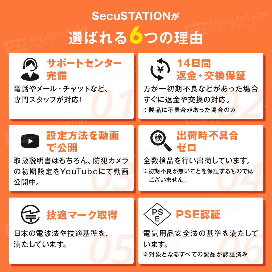 メーカー希望小売価格はメーカーカタログに基づいて掲載しています ≪SC-TB53K(モニター)≫ 型番 SC-TB53K モニターサイズ 5インチ 内臓マイク 対応 内蔵スピーカー 対応 ストレージ 無し(録画はカメラのmicroSDカードに保存されます) 動作環境温度 -10〜60℃ 供給電源 DC5V/2A 消費電力 最大5W 寸法 140mm x 50mm x 100mm 重量 280g バッテリー容量 5050mAh ≪SC-TB53C(カメラ)≫ 型番 SC-TB53C 画素数 300万画素 画角 水平88° 垂直44° 対角106° 内臓マイク 対応 内蔵スピーカー 対応 暗視撮影機能 対応 最大解像度 2304x1296 ストレージ microSDカード:最大128GB(※Class10以上) 供給電源 DC5V/2A 消費電力 最大7.5W 寸法 113mm x 105mm x 82mm 重量 約168g ◆◇14日間返金保証について◇◆ ※14日間返金保証について ・期日:商品到着後14日以内 ・送料:お客様負担 ・条件:未開封の状態であること。到着後、一度でもご利用になられました商品の返品は初期不良の場合を除きお受け出来ません。 ワイヤレス商品等のお客様環境下による影響での返品希望もお受け出来ません。 返品商品到着後に商品の状態を確認させていただいた際、使用済み、または開封済みで初期不良ではないと判断した場合は、商品をお返しさせていただくか、ご購入代金の15%にあたる商品再生手数料をご請求させていただき、返品となります。 商品代金(税込み本体価格)の15%が2,750円未満の場合は一律2,750円(税込)になります。 ※カメラ設置に関する施工費諸費用、お振込み手数料等はお客様のご負担となります。 ※商品に著しい傷等がある場合は、別途追加料金が発生する場合がございます。 あらかじめご了承ください。 ◆◇保証について 保証期間内の無償修理には、ご購入日の確認の為、注文番号(もしくは受注番号)、納品書(お買い上げ明細書)のコピーが必要になります。 修理ご希望の際には、注文番号(もしくは受注番号)確認させて頂きますのでご提示をお願い致します。 保証書および納品書は再発行いたしかねますので、紛失しないよう大切に保管してください。 修理期間中の代替機の貸し出し制度はございません。 ◆◇ご注意 ※ポケットWi-FiやモバイルWi-Fiでは設定できない場合があります。 ※商品ページ上で接続いただけない・推奨していない回線をご案内しております。事前にご確認ください。 こちらからもご確認いただけます。 ※iPadは非対応となります。 ※カメラ本体に防塵防水機能はございません。屋内でのご使用のみとなります。 ※本システムは無線通信を利用した商品であるため、混信や干渉により意図通りに機能を使用できない場合があります。 これによる事故・事件および損害の発生などについて、当社は責任を負いかねますので、あらかじめご了承ください。 ※国内サポート対象外のmicroSDカード、ハードディスク等のオプション品類をご使用いただいた場合、正常な動作については保証をいたしかねます。 ※microSDカードは録画時のみ必要となります。リアルタイムで監視のみ使用される場合は不要でございます。 ※本機を使用できるのは、日本国内のみです。海外では使用出来ません。 ◆◇オプション選択による追加金額のお支払いについて カメラタイプの変更やオプション品を同時購入した事などにより、弊社にてご購入金額の修正が必要になった場合、楽天市場の仕様上、追加金額分についてはポイント決済することが出来ません。 予めご了承下さい。 ※お陰様で現在好評により、お問い合わせ電話大変混み合っております。初期設定等の不明点があるお客様は、一度当店のサポートページにてFAQをご参考して頂き、それでも解決出来ない場合、メールにてご連絡頂きます様、お願い致します。 【検索キーワード】防犯カメラ 監視カメラ 置き型 ワイヤレス SDカード録画 留守 ネットワークカメラ 家庭用 スマホ マイク内蔵 スピーカー内蔵 300万画素 防犯カメラ 家庭用 wifi パンチルト 360° 小型 Wi-Fi 屋内 室内 自動追跡 SD録画 簡単 遠隔監視 無線 送料無料 セキュステーション SecuSTATION 防犯ステーション 新鋭株式会社 SC-TB53K▼増設用カメラはこちら▼